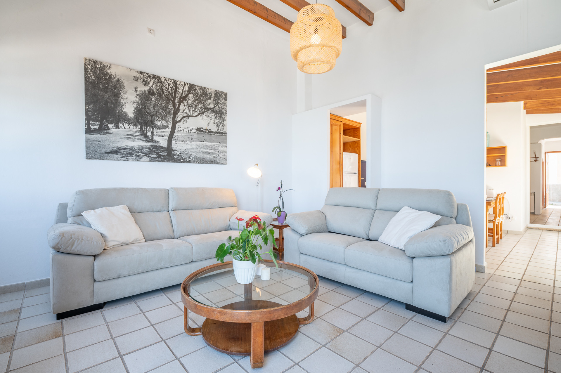 El salón comedor es espacioso y cuenta con una cocina totalmente equipada, una zona de comedor con una mesa para 5 personas y un amplio salón donde se encuentran dos sofás, una chimenea, un televisor y un balcón con vistas impresionantes al puerto de Portocolom.