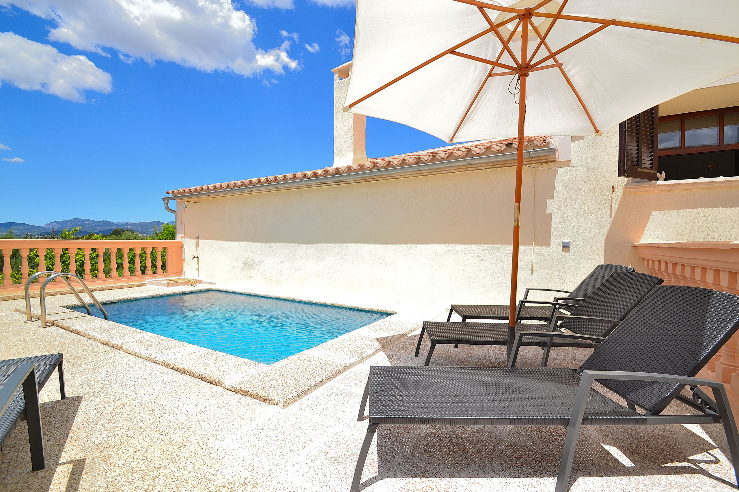 Hay un cuarto de baño en la planta baja y desde el comedor se tiene acceso directo al hermoso patio. Aquí encontrará otra zona de comedor y una barbacoa para las veladas sociales. Además, se llega a la piscina de 10 metros cuadrados, tumbonas ya están listos para usted. Disfrute de la espectacular vista sobre el campo hasta la Sierra de Tramuntana. Para familias con niños pequeños hay que mencionar que la zona de la piscina se puede cerrar.