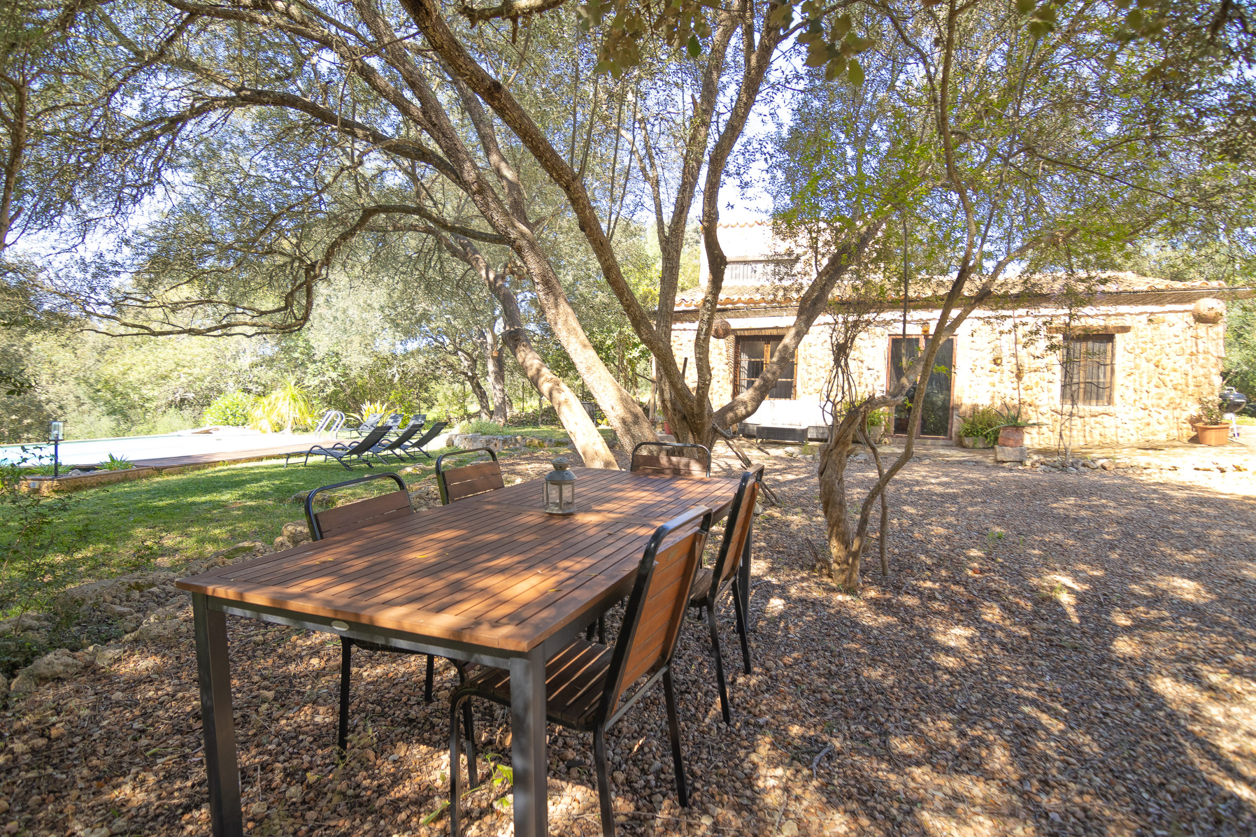 Esta finca tradicional mallorquina destaca por su cuidado jardín con árboles frutales, creando un ambiente natural y relajante para disfrutar al máximo de sus días al aire libre.