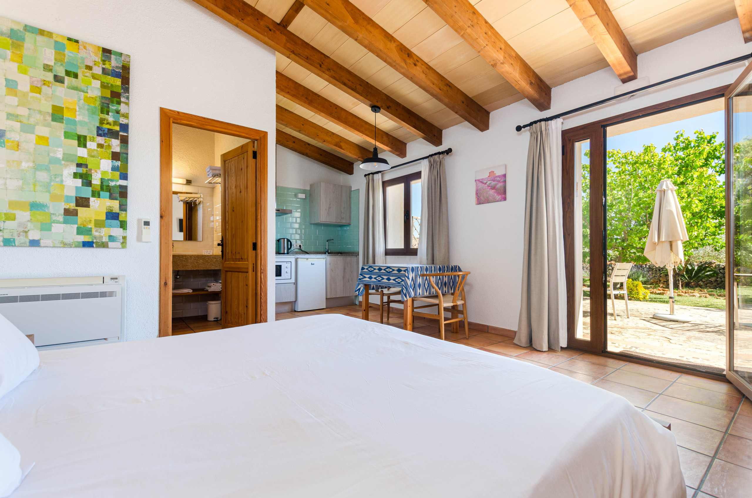 El apartamento dispone de una terraza privada amueblada, perfecta para desayunos al aire libre o momentos de lectura. En el interior, una kitchenette equipada con microondas, fogones de vitrocerámica o inducción, nevera y utensilios básicos permite preparar comidas con comodidad. El salón cuenta con televisión y conexión WiFi, una cama doble y está climatizado con aire acondicionado y bomba de calor. Hay un baño privado con ducha y secador de pelo.