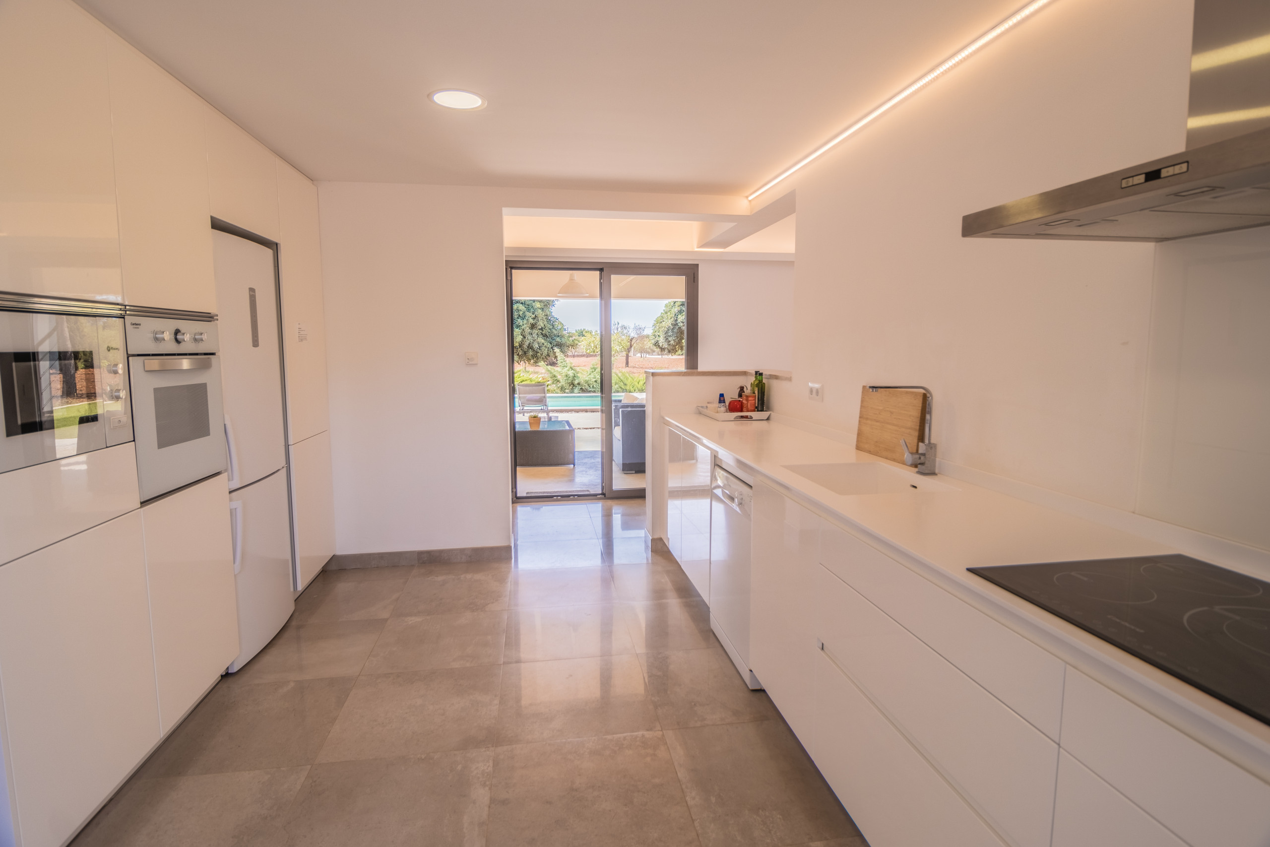 En el interior, la cocina independiente y completamente equipada cuenta con electrodomésticos modernos: placa eléctrica, nevera, microondas, horno, congelador, lavavajillas, lavadora, secadora, cafetera, hervidor, tostadora y exprimidor. La casa también incluye plancha, secador de pelo y TV satélite en varios idiomas (español, inglés, alemán).
