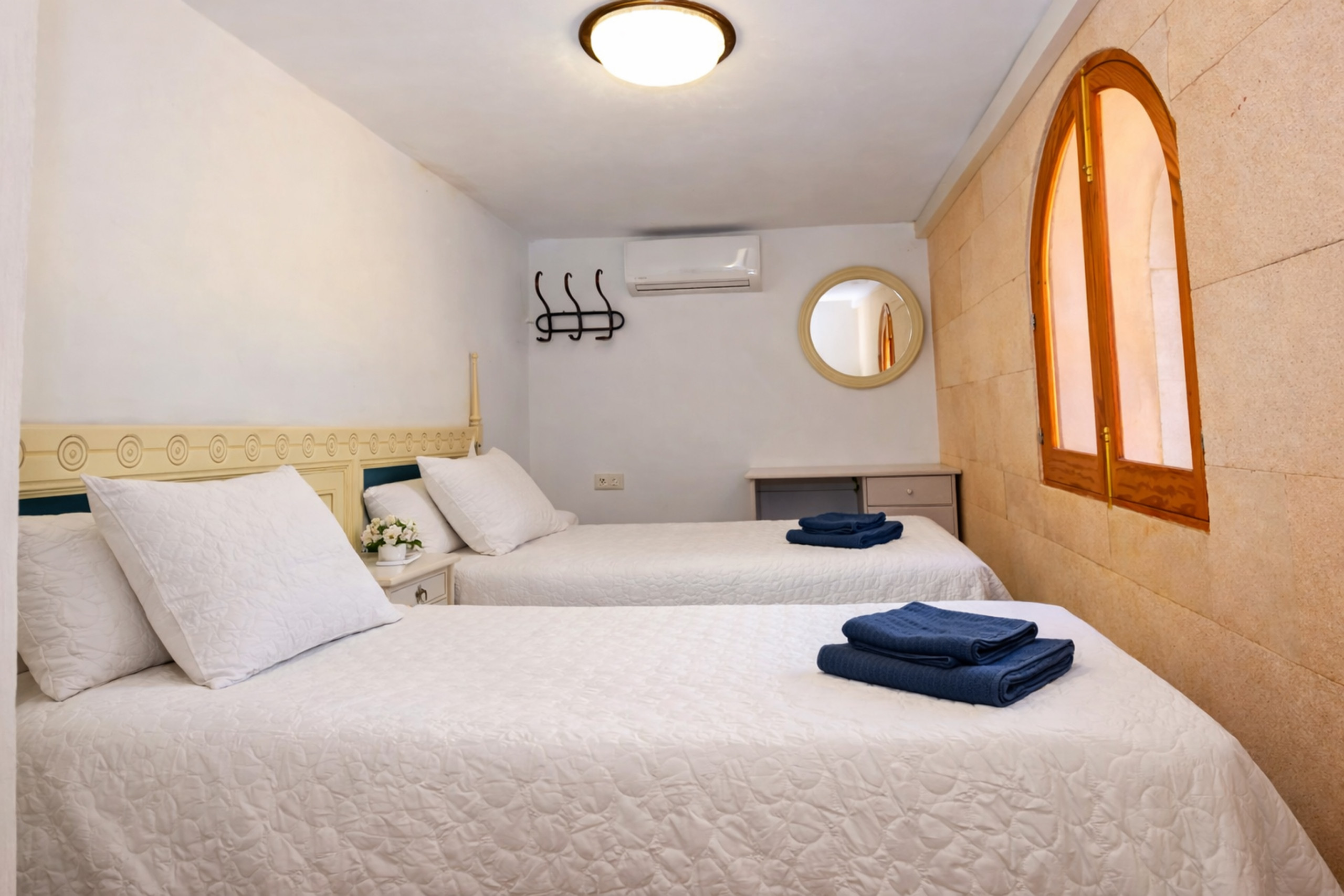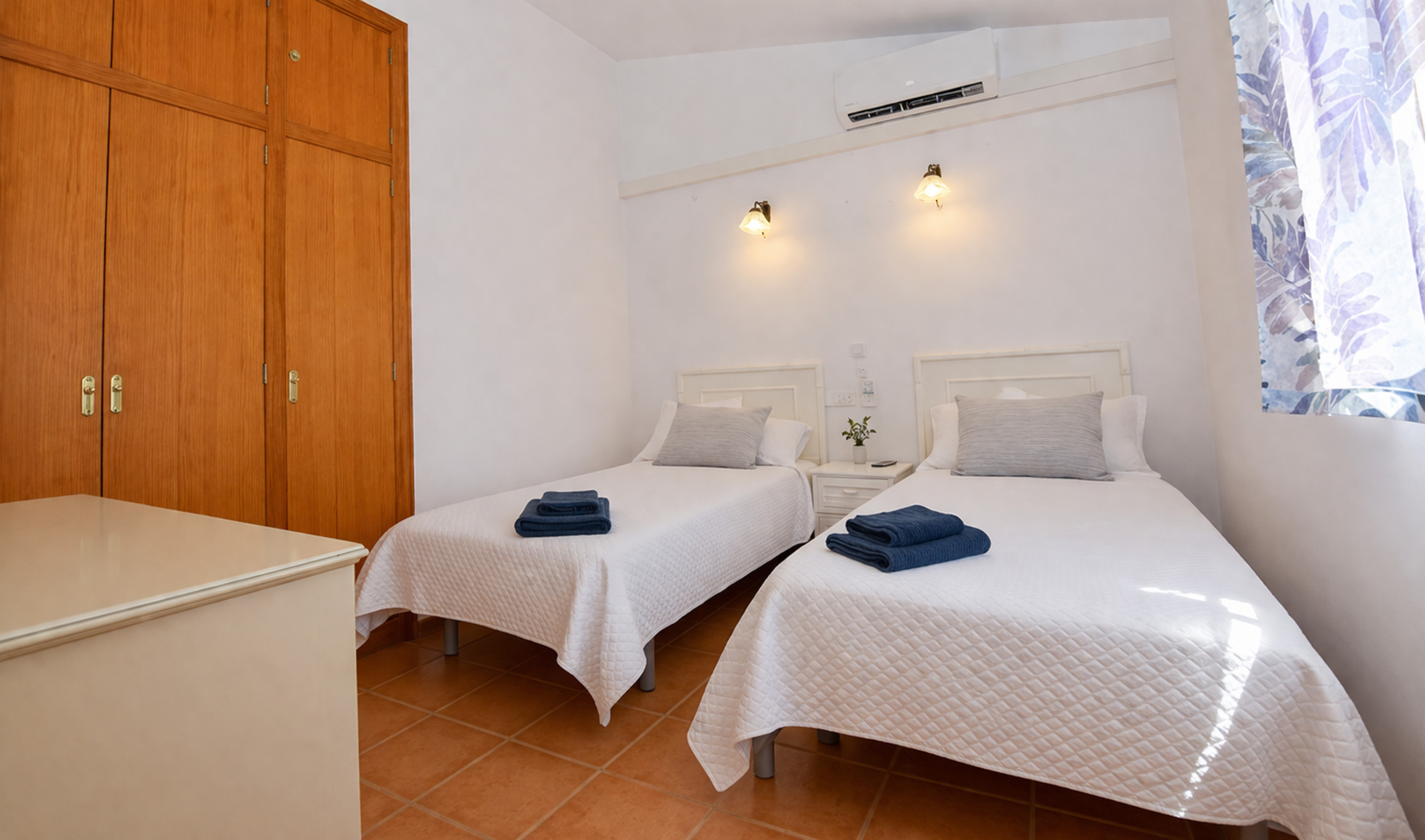Hay cuatro dormitorios, todos con dos camas individuales, y dos baños, en la planta alta tres y un baño; La cuarta habitación y el segundo baño están en la planta baja.