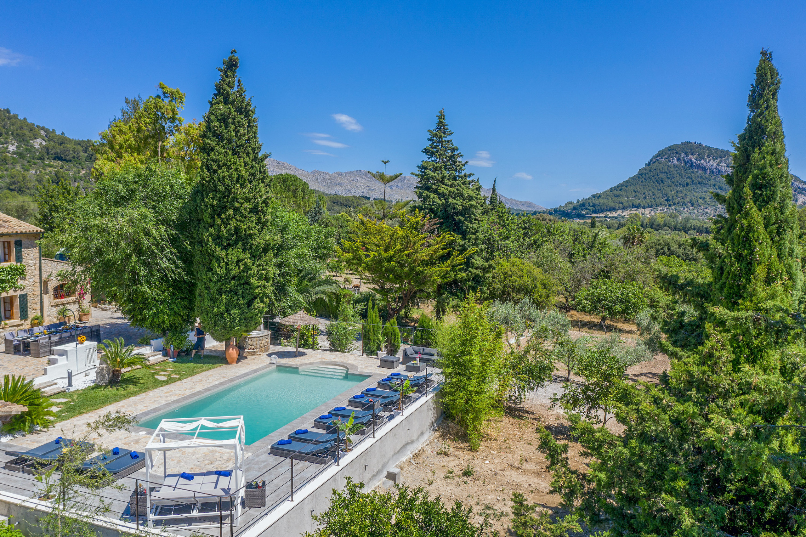La propiedad se encuentra cerca Pollensa, muy cerca de supermercados y otros servicios. Las playas más cercanas son la bonita Cala de San Vicente y Puerto de Pollensa. Pollensa es un pueblo mallorquín con gran encanto, muy acogedor con sus excelentes restaurantes en la plaza del pueblo como el “Q11” y “U Plaça” y su conocido mercado dominical. Además, el pueblo tiene sus conocidas escaleras del Calvario, 365 escalones que nos llevaran a la parte más alta del pueblo donde podremos disfrutar de unas vistas inmejorables del pueblo y sus montañas de alrededor, así como de las playas de Cala San Vicente, Puerto Pollensa y Puerto de Alcudia. El campo de golf de Pollensa se encuentra a pocos kilómetros de la casa.