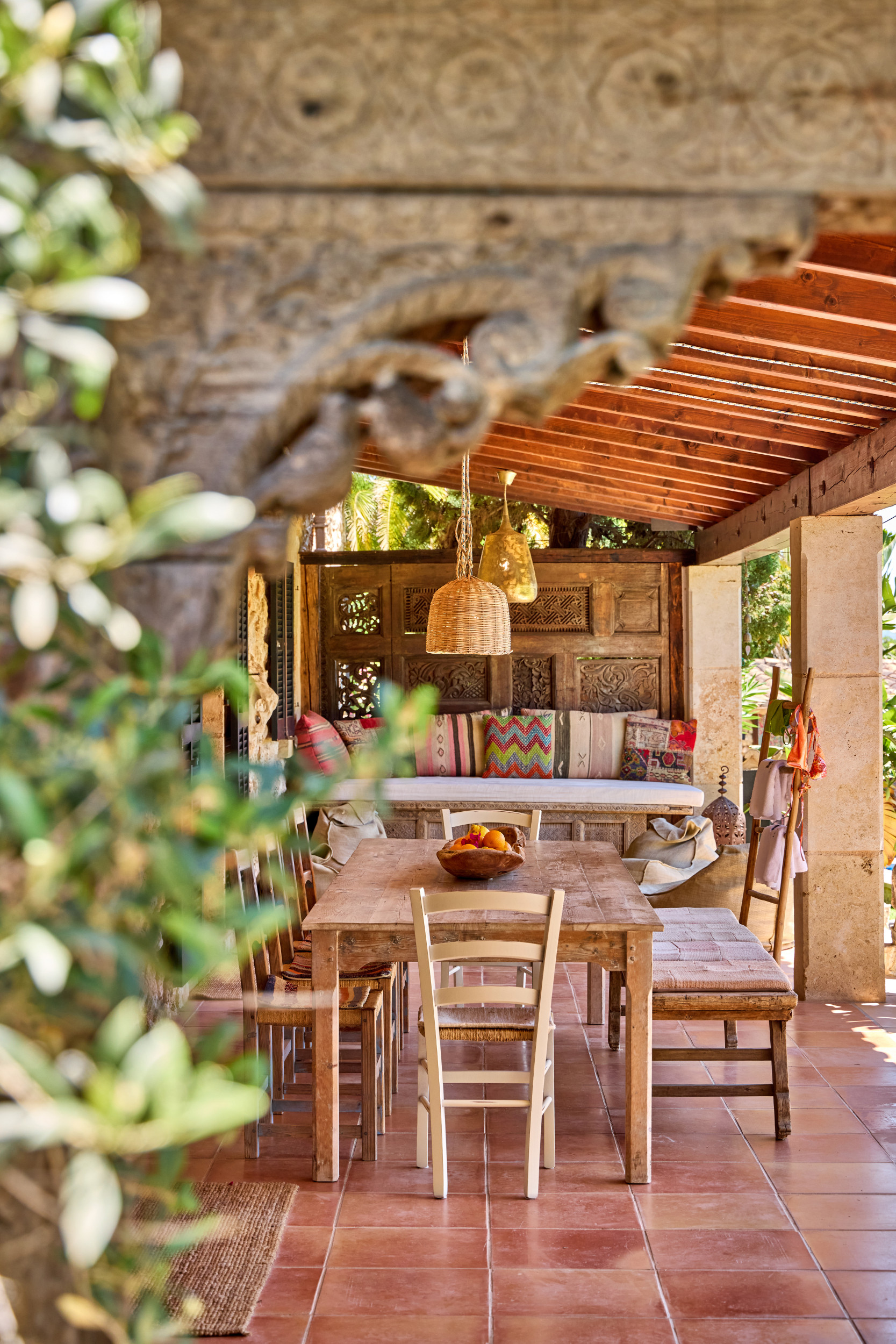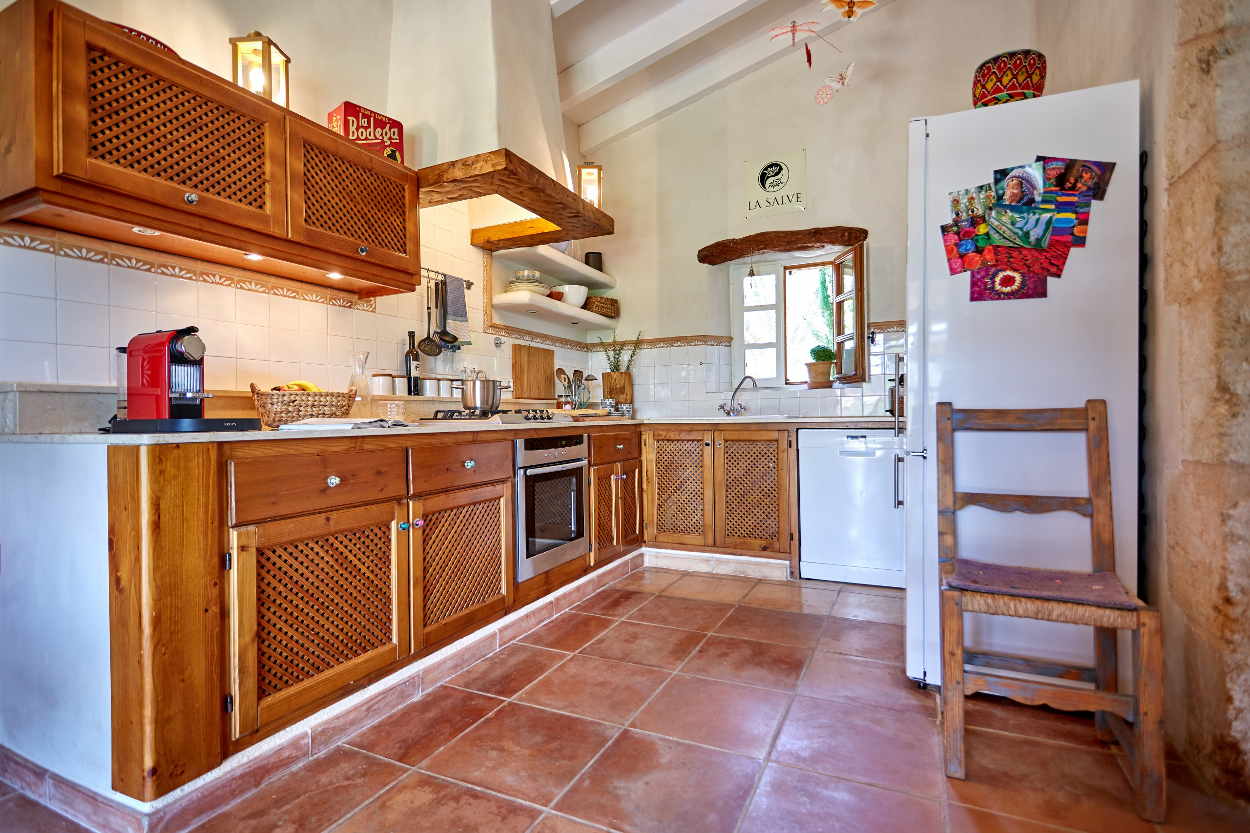 El interior, decorado en un tradicional estilo mallorquín, destaca por sus techos con vigas vistas y el uso predominante de la madera, lo que aporta calidez y carácter. El salón-comedor cuenta con calefacción, TV vía satélite y Wi-Fi gratuito, creando un ambiente cómodo y familiar.