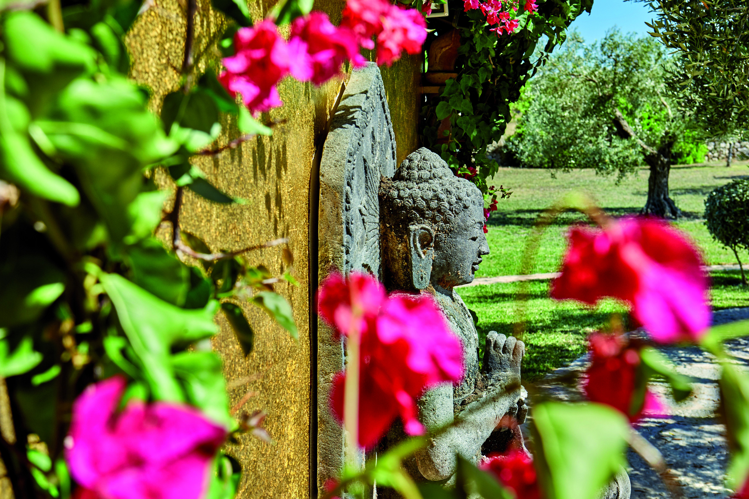 La propiedad, totalmente vallada y apartada, ofrece privacidad absoluta para familias y amigos. Sus exteriores invitan a la contemplación: una majestuosa cabeza de Buda preside la piscina, esculturas de elefantes de piedra acompañan desde la terraza, y detalles tallados en madera, piedra y materiales naturales evocan rincones de Marruecos, Indonesia, África, Tíbet y España.