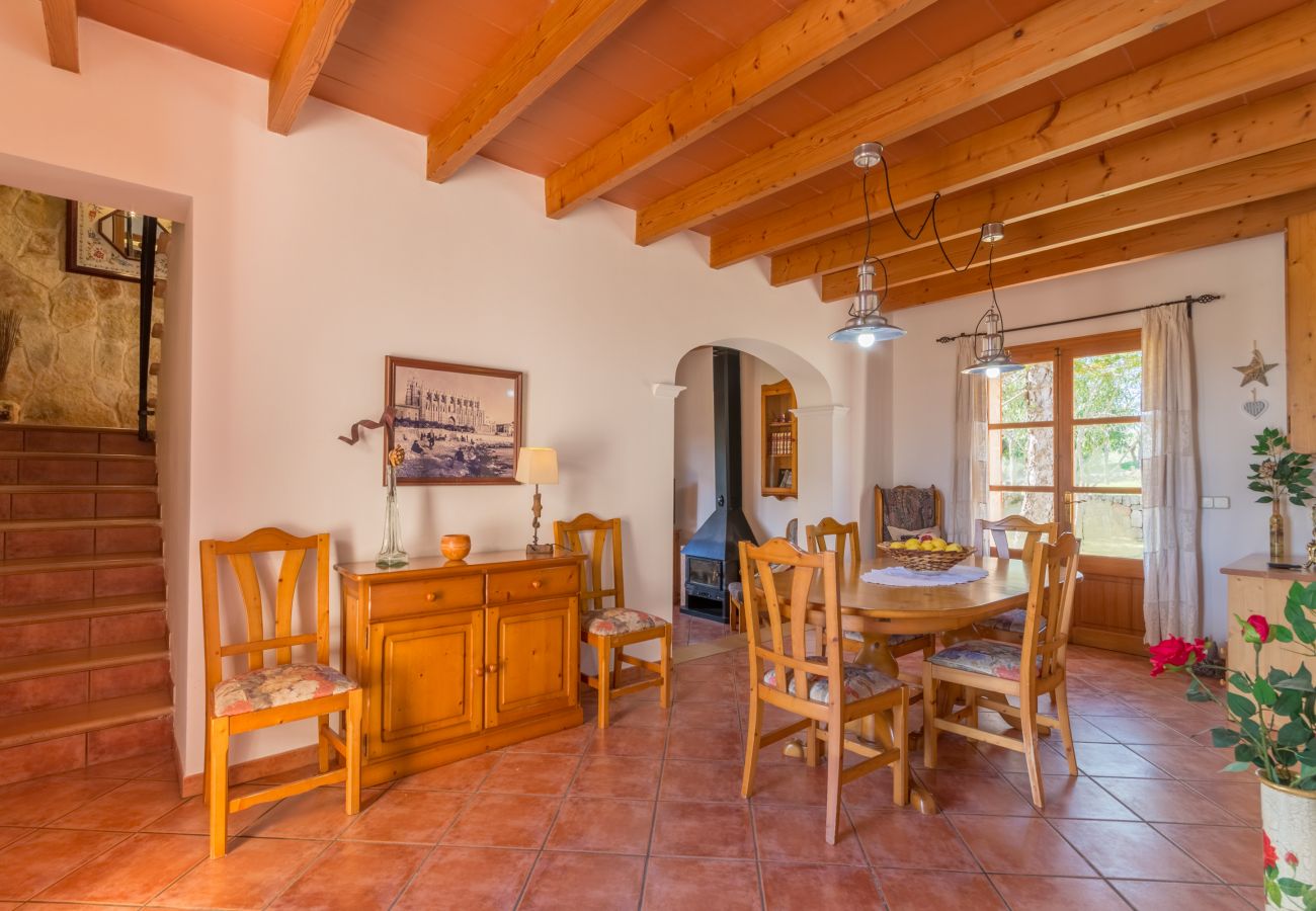 El diseño interior de la casa es un homenaje a la rusticidad mallorquina, con paredes blancas que reflejan la luz natural, techos con vigas de madera vista y una decoración en madera de pino que brinda calidez y autenticidad. La sala de estar, ubicada en un nivel inferior al comedor, crea una atmósfera acogedora y diferenciada. La cocina es un deleite para los sentidos, con sus baldosas rústicas y una mesa espaciosa para 6 personas, perfecta para disfrutar de comidas en familia.