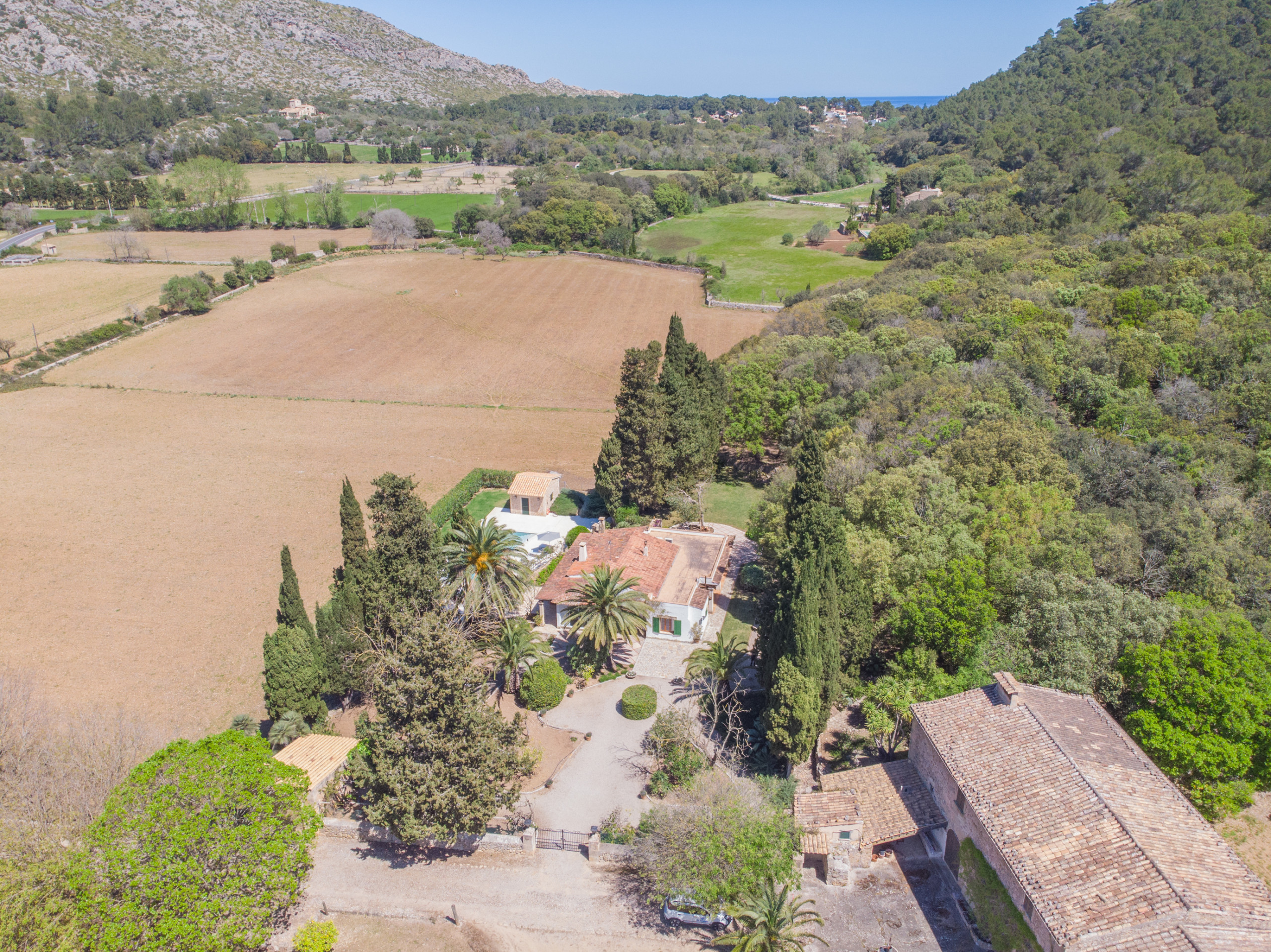 La villa se encuentra en una gran finca rural dentro de la sierra de Tramuntana, un entorno tranquilo y privilegiado donde disfrutar de la naturaleza mallorquina. Entre sus rincones más especiales destaca un bonito encinar, donde es habitual ver ovejas pastando.