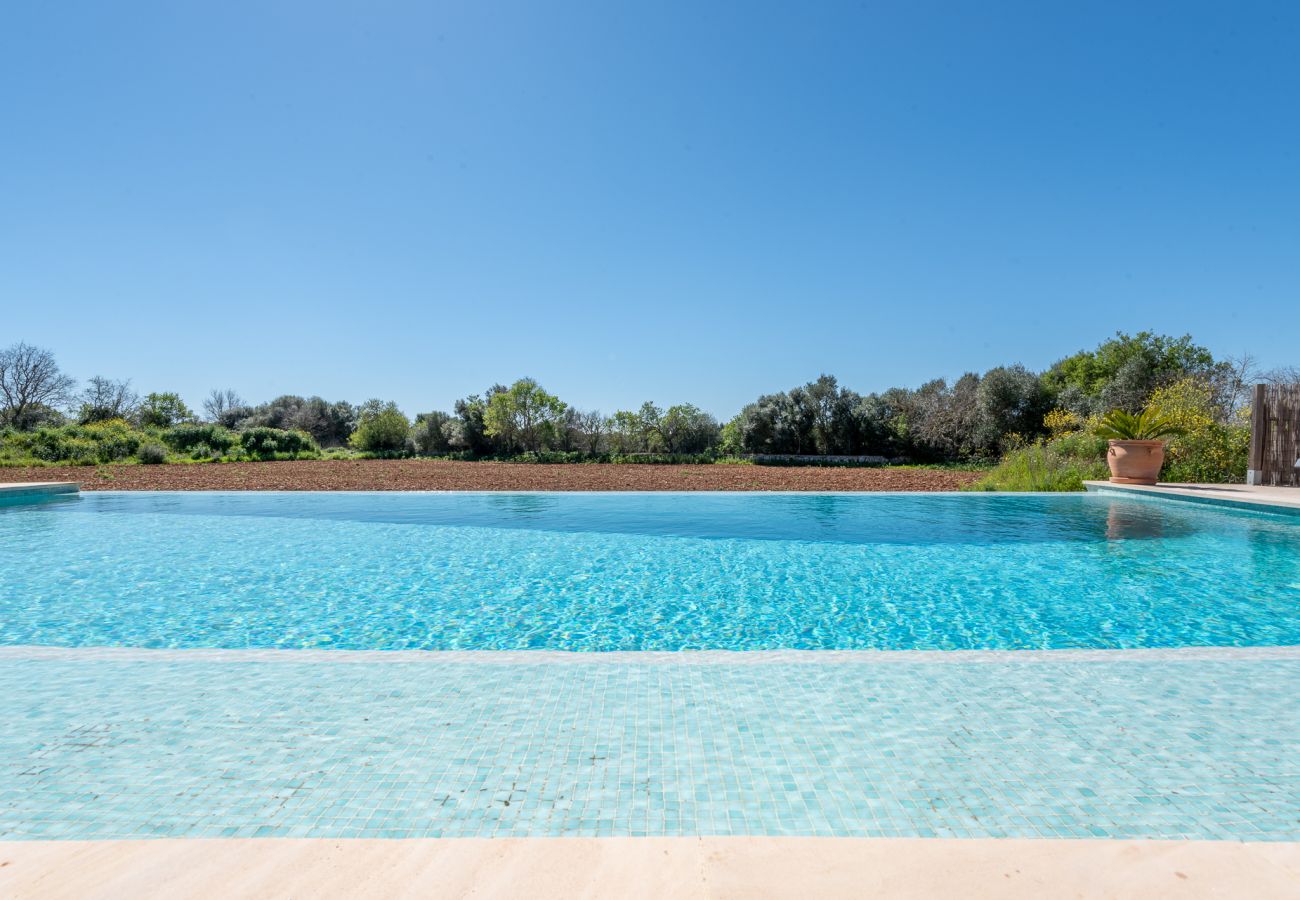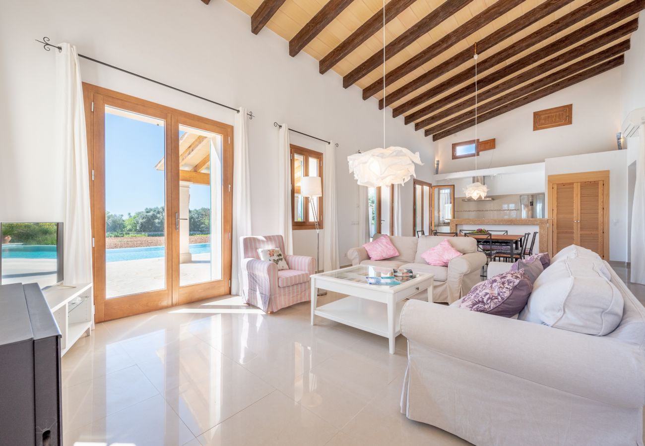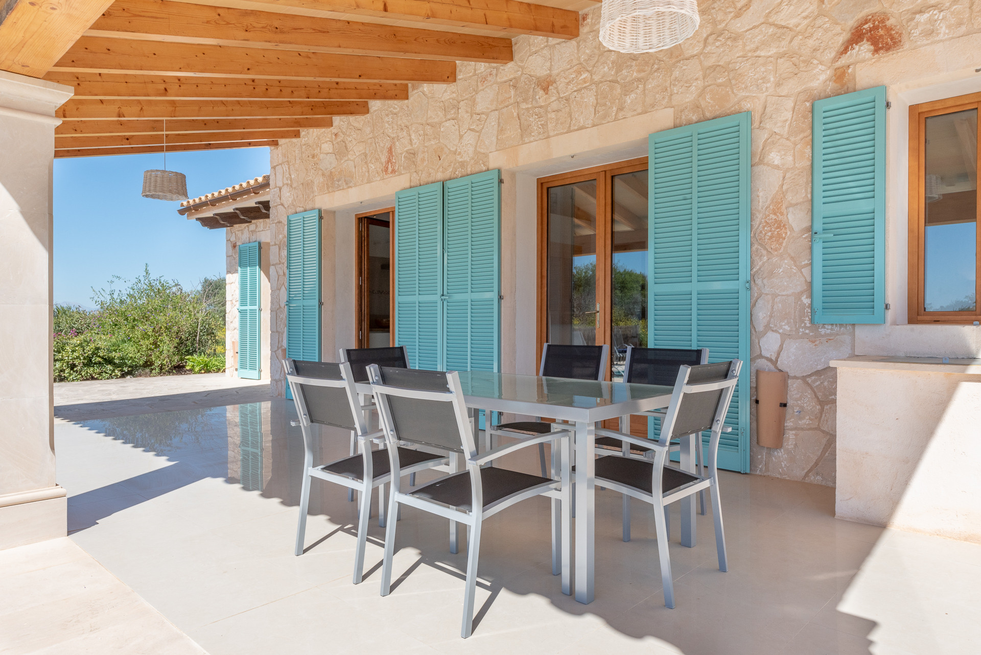 Desde fuera parece la típica casa de campo con su fachada de piedra y persianas de estilo mallorquín, pero por dentro es moderna y muy funcional. Todas las habitaciones de esta propiedad están distribuidas en una sola planta.