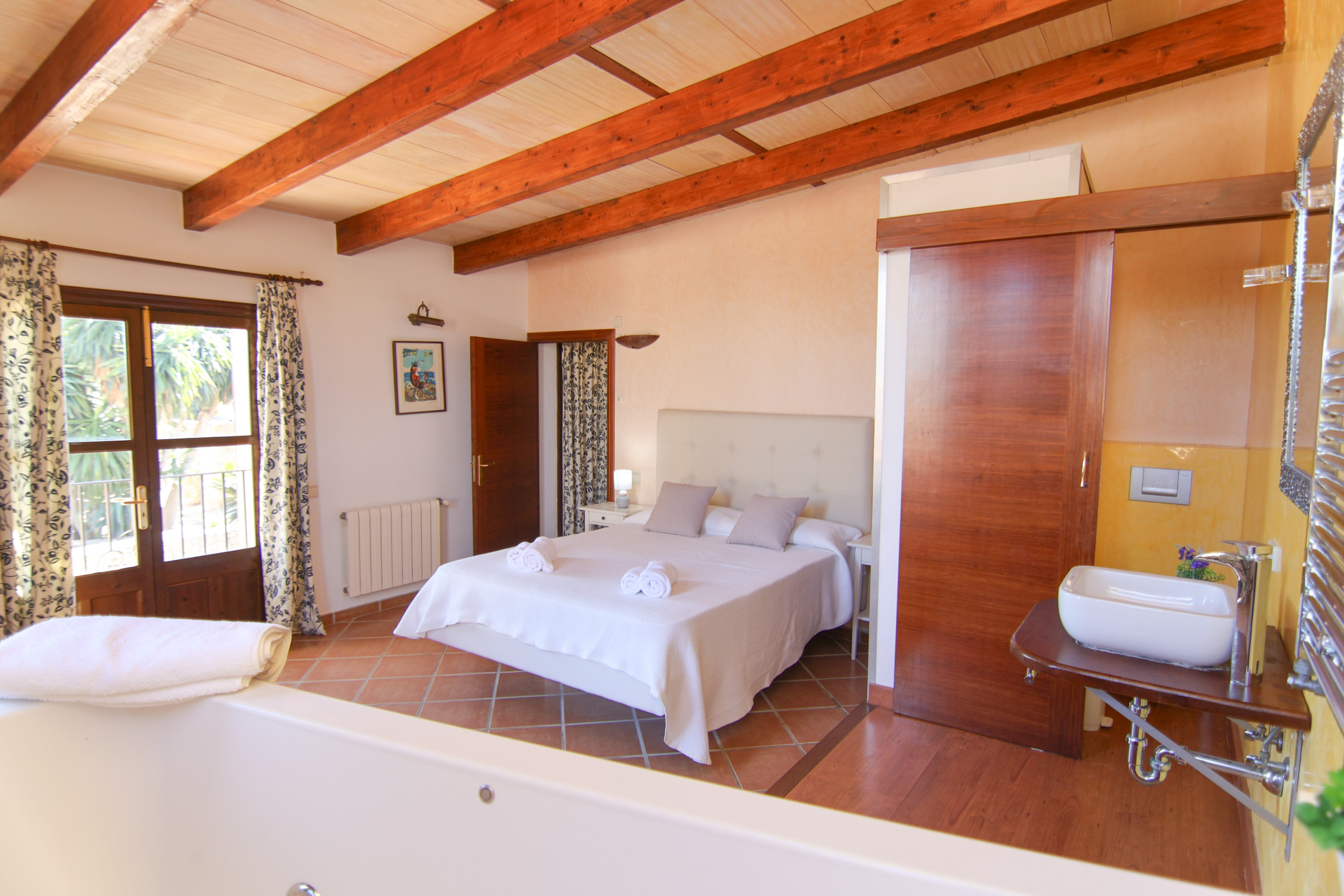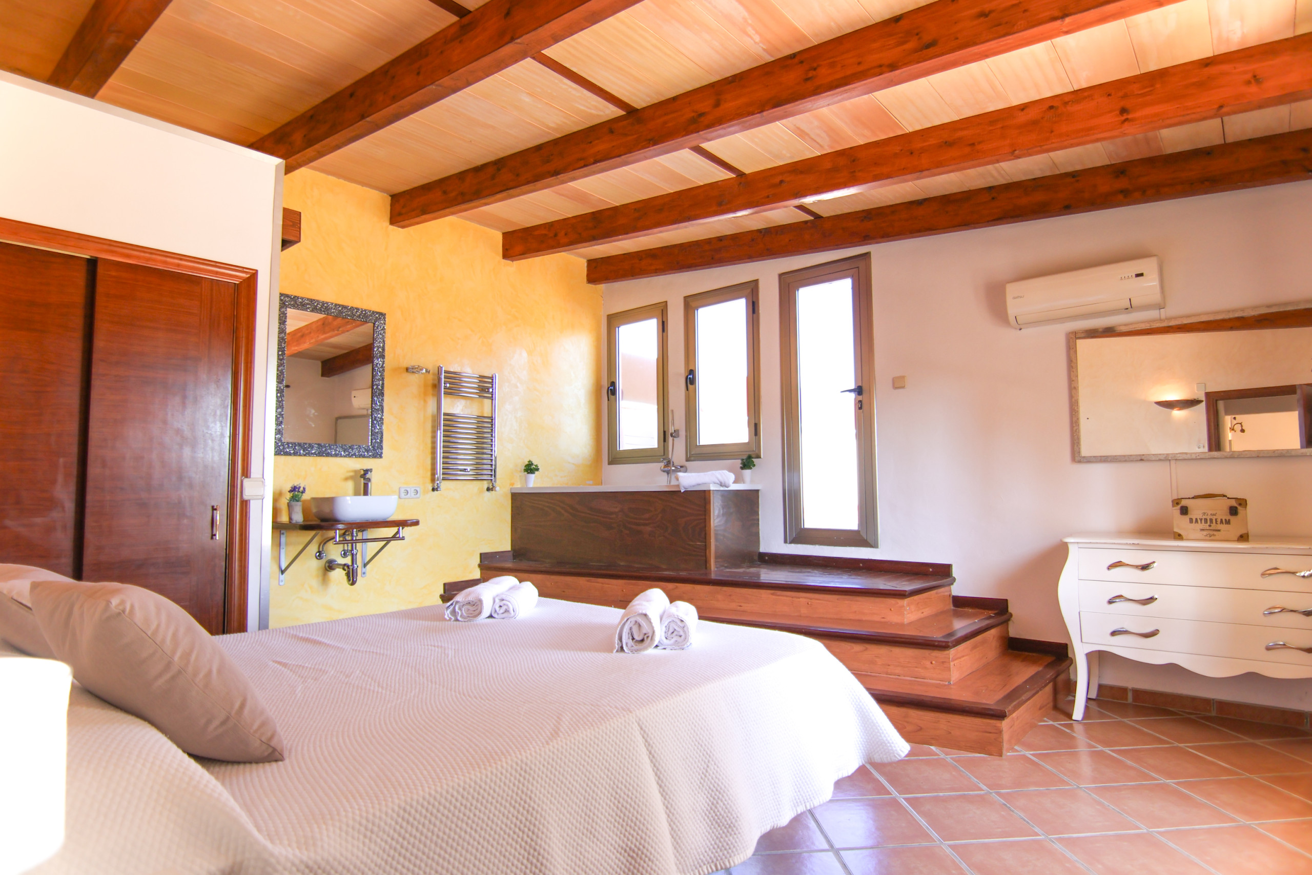 En la planta superior se encuentran los dos últimos dormitorios, decorados en estilo mallorquín tradicional, con vigas de madera vistas, que aportan un carácter auténtico y acogedor a la vivienda.