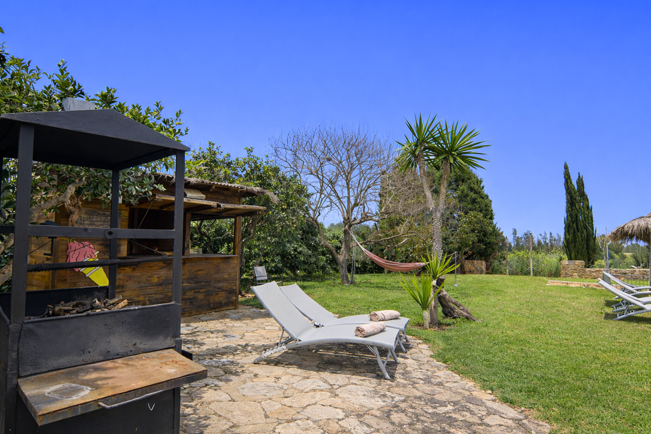 La propiedad está completamente vallada y se accede a través de una gran puerta de hierro forjado, con parking exterior dentro de la misma finca para varios vehículos. En el exterior los huéspedes podrán disfrutar de un amplio jardín con zonas de descanso, 75 m² de terrazas, una fantástica piscina privada rodeada de césped, equipada con tumbonas y sombrillas, así como una amplia zona de barbacoa perfecta para comidas al aire libre. También hay diferentes espacios para relajarse, como un acogedor patio empedrado con sombra, una gran terraza cubierta para comer y una agradable zona de estar con hogar exterior.