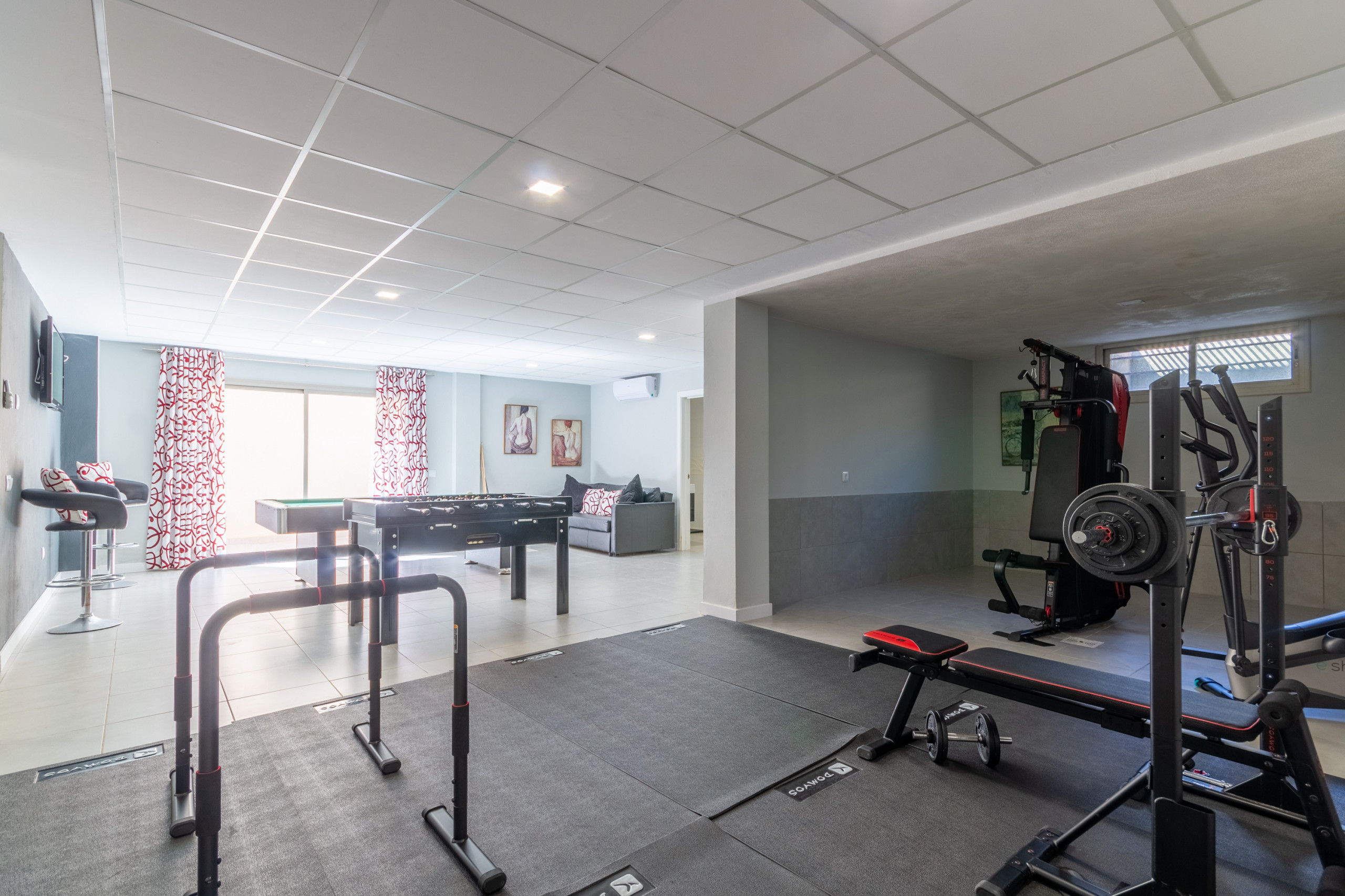 Todo el patio está vallado con una gran puerta de acero que da acceso a este diverso paraíso de jardines. Las características incluyen céspedes verdes, un parque infantil, campos de voleibol de playa y fútbol, ping-pong y una enorme área de piscina de agua salada (10m x 12m) con tumbonas, sombrillas, una ducha exterior y una zona de descanso bajo una vela de sol mediterránea. La casa ofrece una amplia terraza cubierta equipada con cómodos muebles de jardín, perfecta para cenas familiares en la larga mesa.