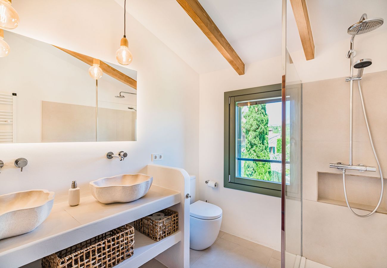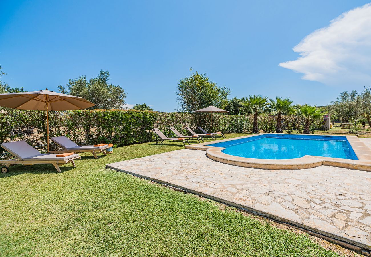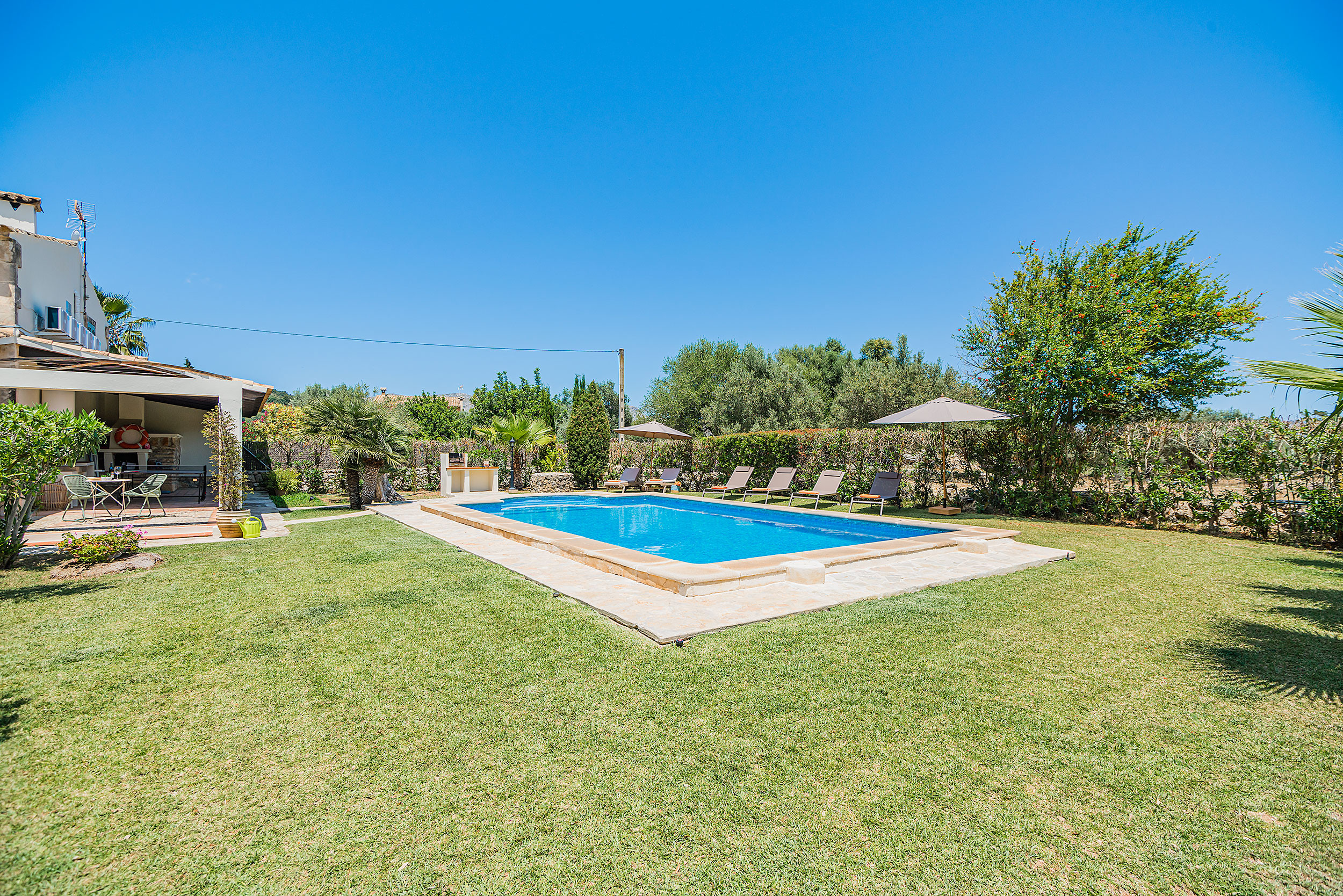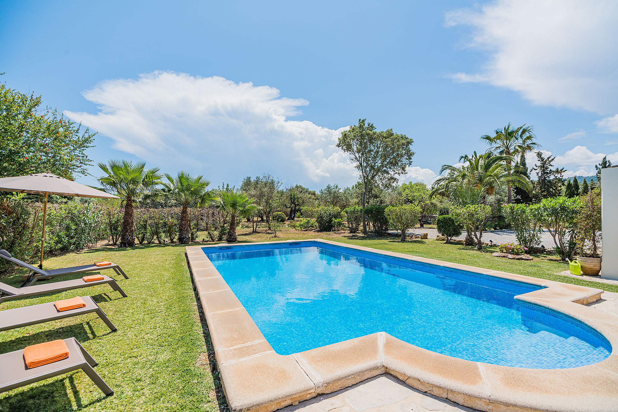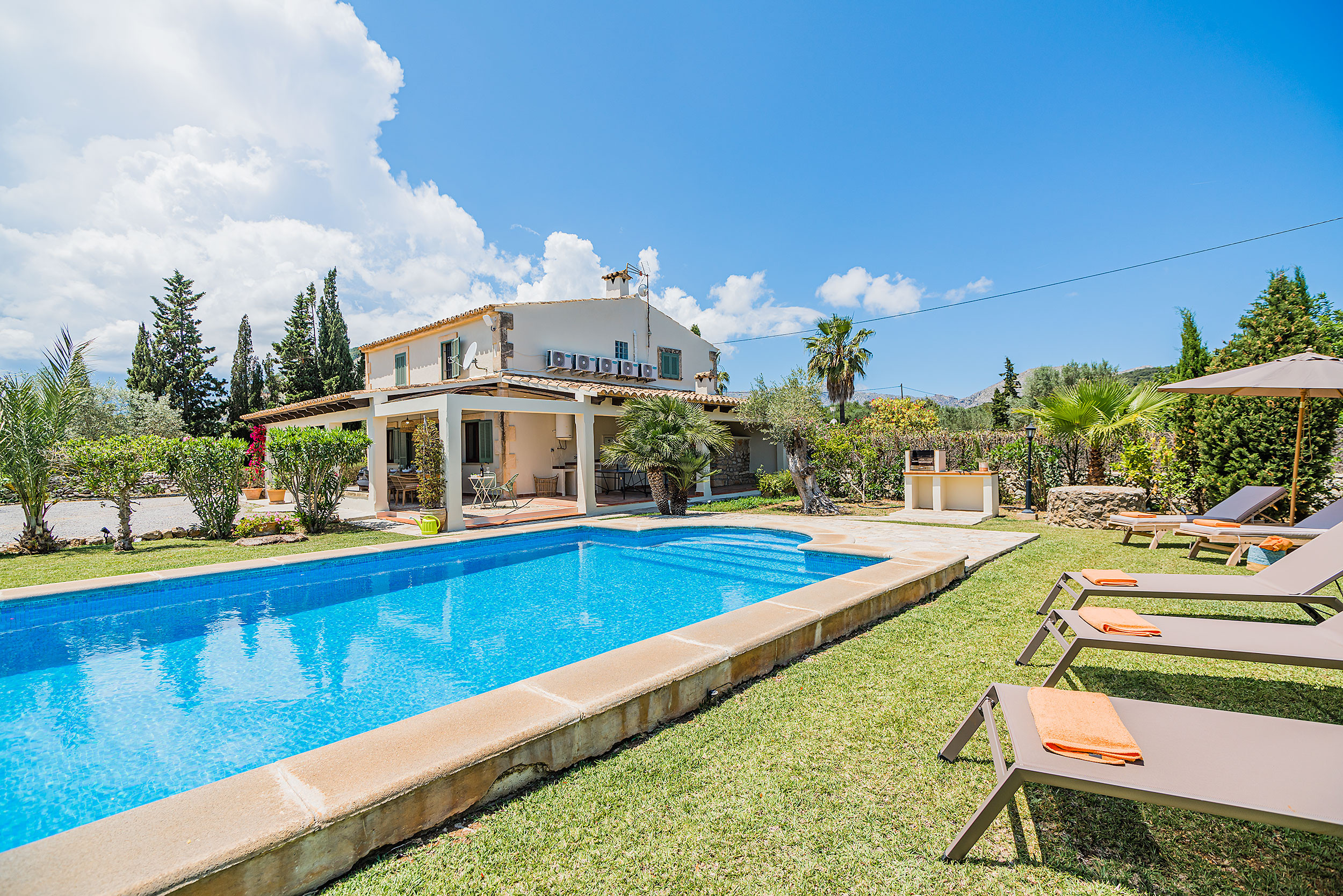 Se trata de una hermosa villa familiar en el campo de las afueras de Pollensa. Es una casa de piedra, con una gran piscina y mucha extensión de tierra, con césped y plantas mediterráneas y árboles. La villa es adecuada, en parte, para el acceso en silla de ruedas y tiene un camino cerrado. Se encuentra en un lugar muy tranquilo en una tranquila camino estrecho de la carretera de Pollensa a Alcudia. Dentro de la casa, todas las habitaciones tienen paredes blancas brillantes, baldosas de terracota y techos con vigas tradicionales de Mallorca. El salón-comedor tiene una larga mesa de comedor, dos sofás, televisión, un DVD y un reproductor de CD. Las puertas dobles de aquí dan a una terraza muy bonita cubierta que se extiende alrededor de dos lados de la casa, con vistas a los jardines y la piscina.