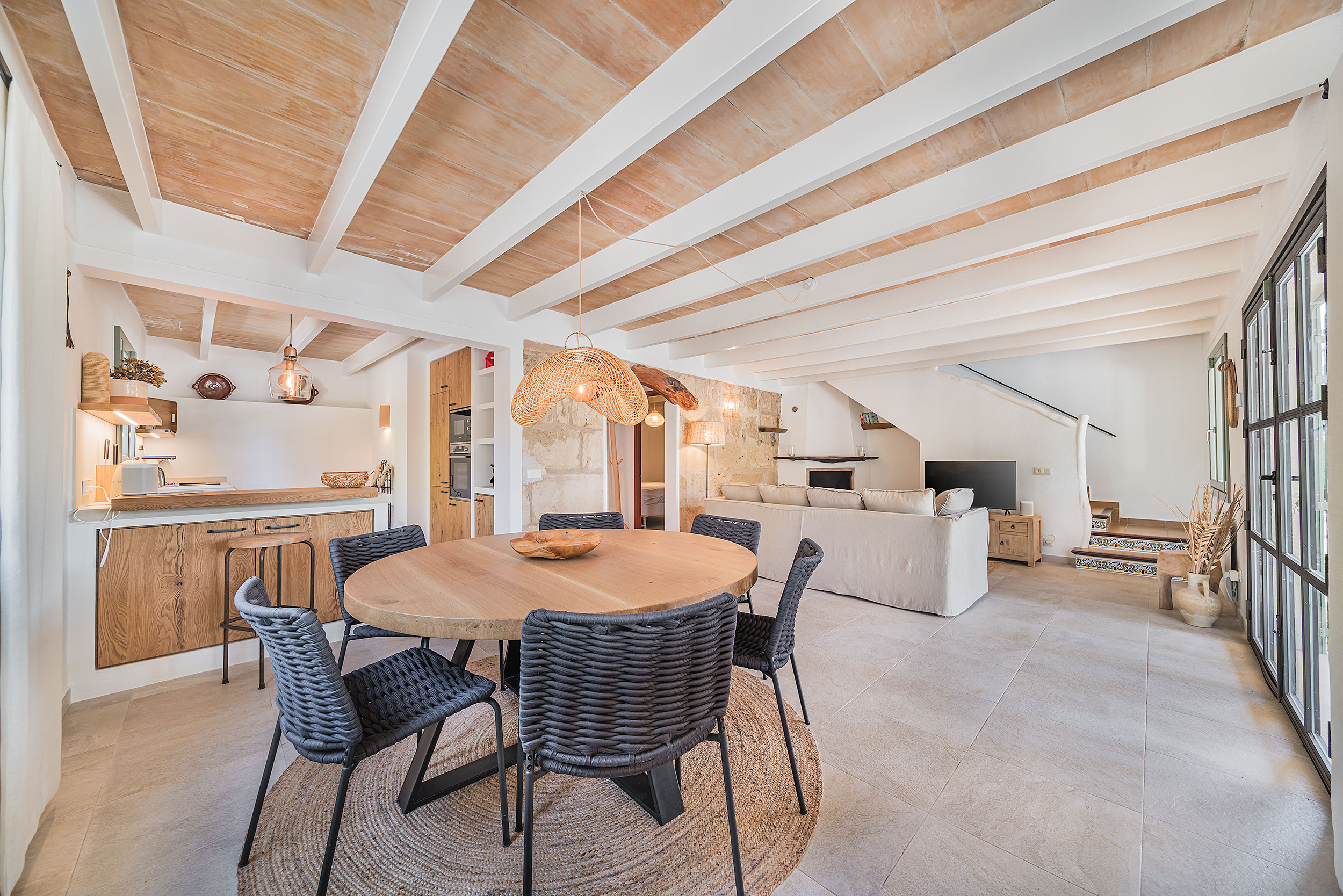 La casa está toda a nivel del suelo con suelos de baldosas, paredes blancas y muebles mallorquines de madera oscura.