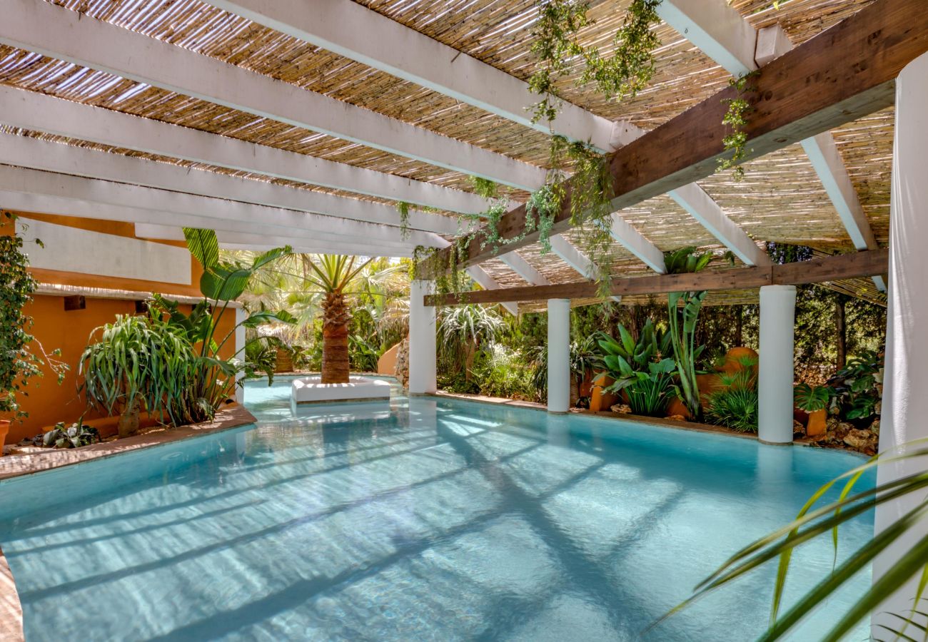 Al aire libre, la villa sorprende con dos magníficas piscinas. La más grande, de agua salada, es un verdadero paraíso con sus 33 x 33 metros de superficie y rodeada de palmeras, creando un ambiente de resort. La segunda, de cloro, mide 20 x 20 metros y cuenta con una terraza chill-out amueblada con sofás y una zona de comedor. Como si de una playa privada se tratara, hay una zona de arena con tumbonas, sombrillas y un espacio de relax perfecto para descansar.