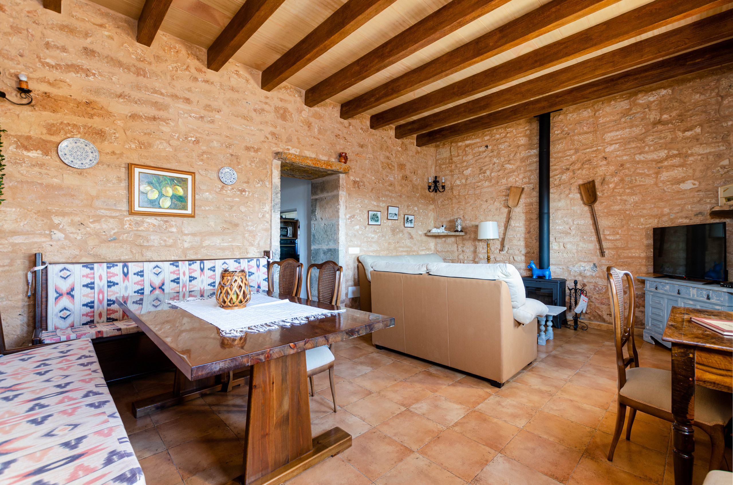 En el interior, encontrarás un salón con aire acondicionado y televisión de satélite, una estufa de leña, zona de comer con bancos y sillas, y una cocina independiente totalmente equipada con horno, vitrocerámica, cafetera italiana y de filtro, lavavajillas y tostadora. También hay wifi gratis disponible en toda la casa. Para descansar hay tres dormitorios dobles con aire acondicionado, uno de ellos con baño en suite con ducha. Además, hay dos baños más con ducha, secadores de pelo, gel de ducha, champú, y una lavadora. Las ventanas tienen mosquiteras para mayor comodidad. Se facilitan toallas de piscina.