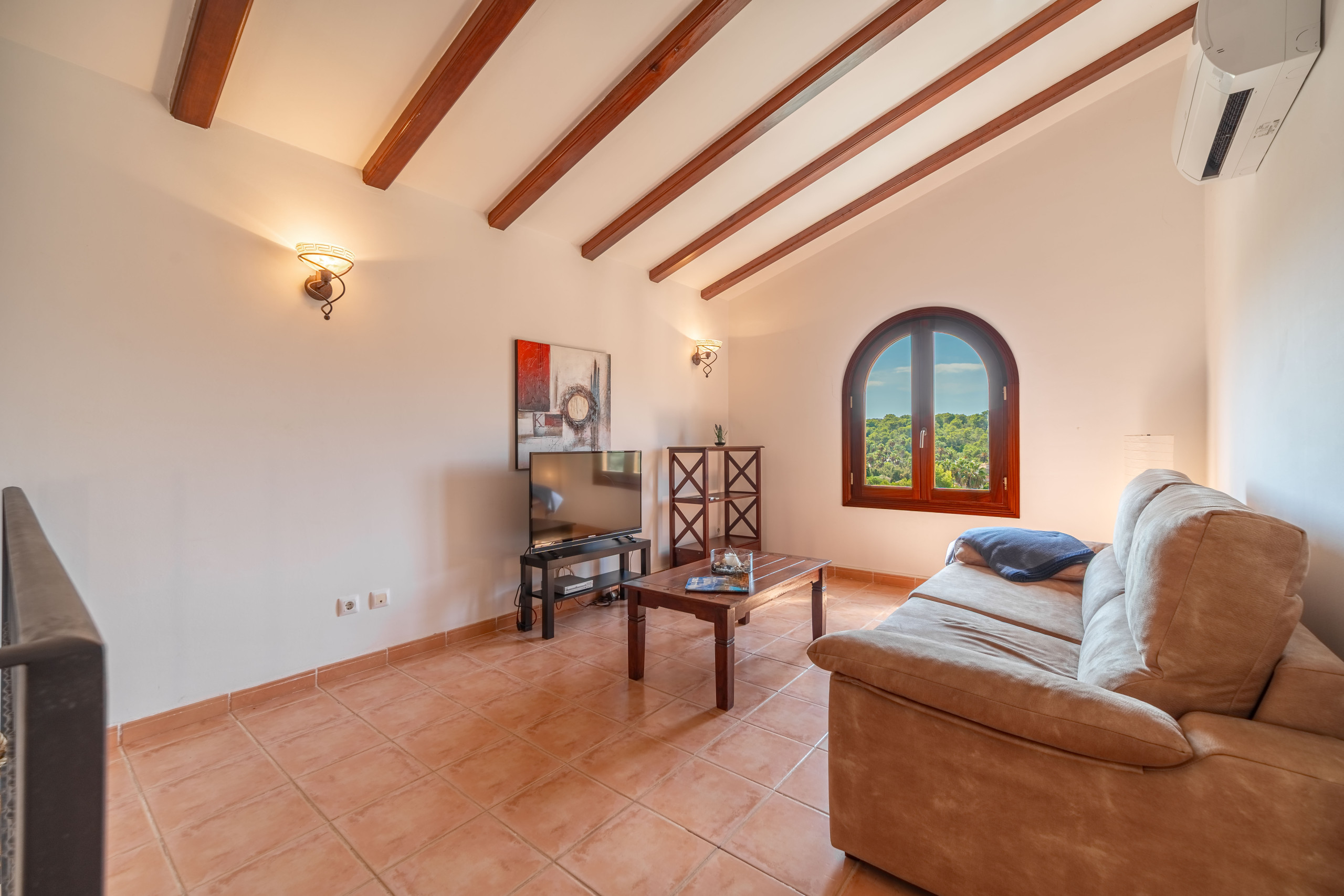 Das helle Wohnzimmer im Erdgeschoss ist mit Klimaanlage, einem gemütlichen Sofa, TV-Bereich und Essplatz ausgestattet.