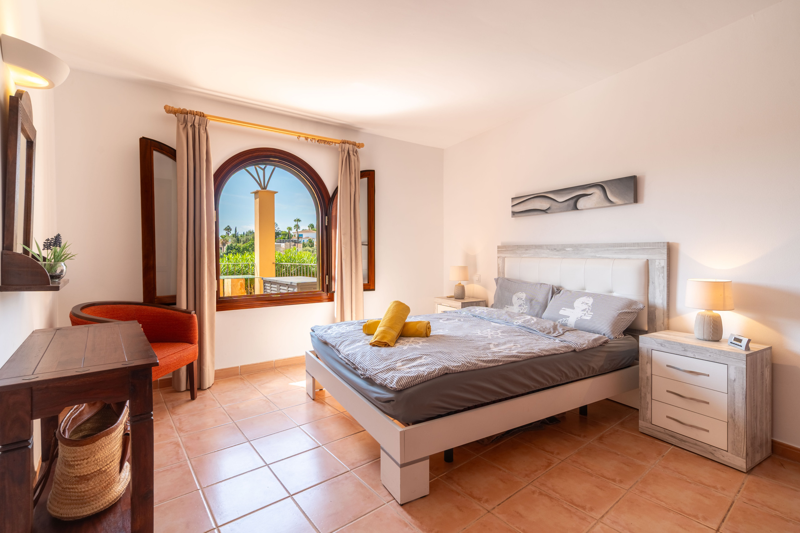 Das Hauptschlafzimmer hat ein Doppelbett, ein eigenes Bad sowie eine private Terrasse – ideal für Panoramablicke und unvergessliche Sonnenuntergänge.