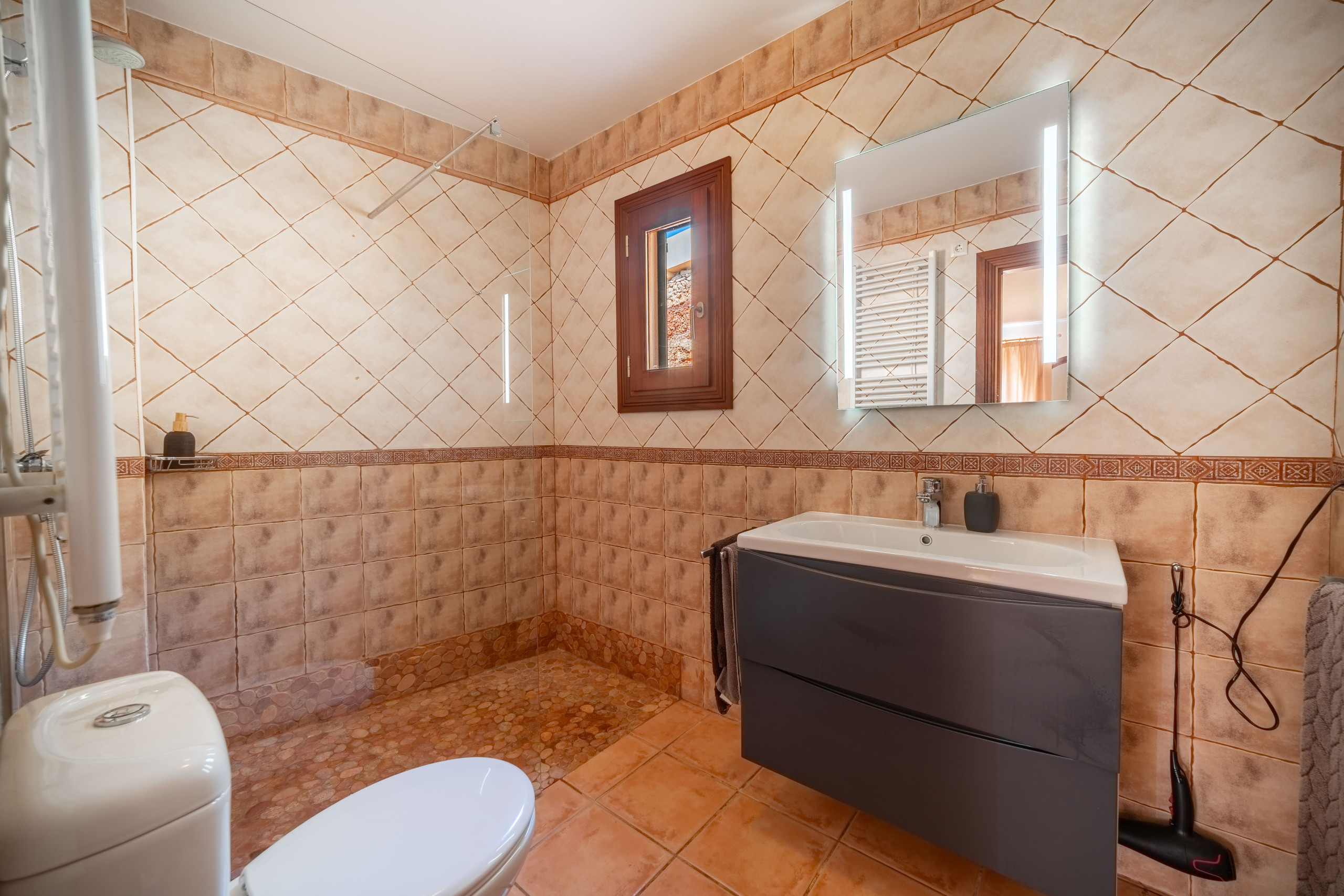 Genießen Sie einen entspannenden Aufenthalt in diesem charmanten 80 m² großen Reihenhaus, das vollständig ausgestattet und darauf ausgelegt ist, Komfort und Ruhe zu bieten. Mit Platz für 3 Personen verfügt es über 2 lichtdurchflutete Schlafzimmer im ersten Stock und 2 vollständige Badezimmer, 1 Gäste-WC im Erdgeschoss, einen geräumigen Wohnbereich und eine private 25 m² große Terrasse, die perfekt zum Frühstücken im Freien oder zum Genießen der warmen mallorquinischen Nächte ist.