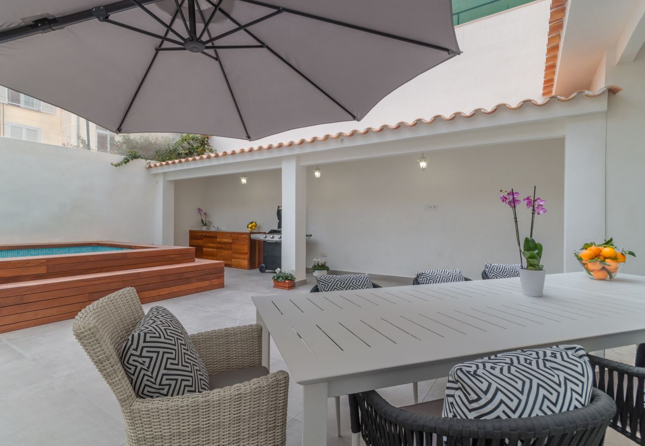 Unsere exquisites Stadthaus "Miquel Santandreu" bietet neben Toplage auch absolut zeitgemässe Ausstattung und Komfort. Im schicken Innenhof gibt es einen privaten Pool, umrahmt mit afrikanischem Teakholz und passender Grillzone dazu. Eine lange Esstafel bietet ausreichend Platz und Komfort wenn es ans gemeinsame Frühstücken geht. Gesellige Grillabende werden hier mit netter Beleuchtung rund um die Terrasse ganz sicher zum Erfolgserlebnis. Das 190 m² grosszügige Interieur ist auf dem neuesten Stand eingerichtet und dekoriert. Der Mix aus elegantem Weiss, Cremeton und Holzfussboden schafft eine herrlich angenehm Wohnatmosphäre welche durch die offene Raumgestaltung noch unterstrichen wird. Der Wohnraum ist in 2 Ebenen aufgeteilt, wobei sich im Erdgeschoss der gemeinschaftliche Wohnbereich befindet. Dieser besteht aus kompletter Designer-Küche mit offenem Esszimmer und dem dazugehörigem Wohnzimmer mit super bequemen Polstermöbeln und Xxl-TV. Von hieraus hat kommt man auch direkt in den Wohlfühl-Innenhof. Ausserdem befindet sich noch 1 Doppelschlafzimmer mit grossem Doppelbett und Badezimmer ensuite, sowie einem separaten Gäste-WC im Erdgeschoss. Die anderen 4 Doppelschlafzimmer befinden sich im oberen Stock. Auch hier ist jedes Zimmer mit Bad en suite und Klimaanlage ausgestattet. Alle Bereiche sind super durchgestylt und versprühen Eleganz und Qualität mit minimalistischem Hauch. Die gesamte Unterkunft verfügt über gratis Wifi-Internet, Klimaanlage und Heizung. Betrachtet man den Standort und die Ausstattung kann man die Unterkunft auch ideal für Geschäftsreisen und Meetings nutzen. Die unmittelbare Nähe zum Zentrum und zur Hafenpromenade macht die Unterkunft sehr attraktiv, nicht nur zu besonderen Veranstaltungen wie die Segelregatta "La Copa del Rey", Konzerte, Festivals und vieles mehr...hier ist Lifestyle garantiert....