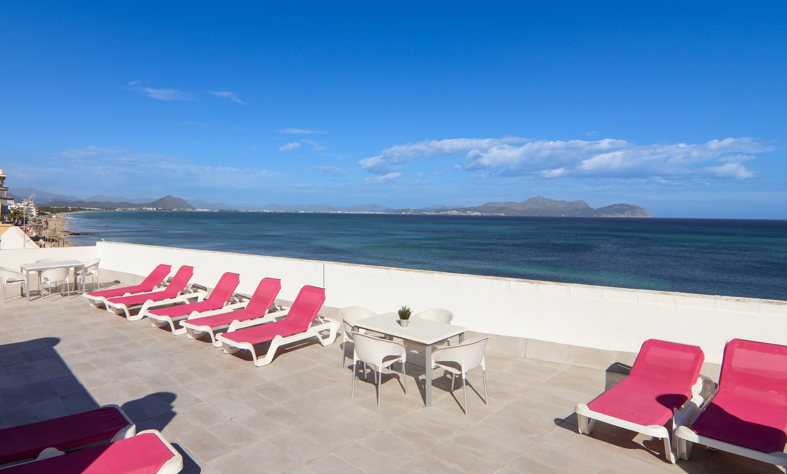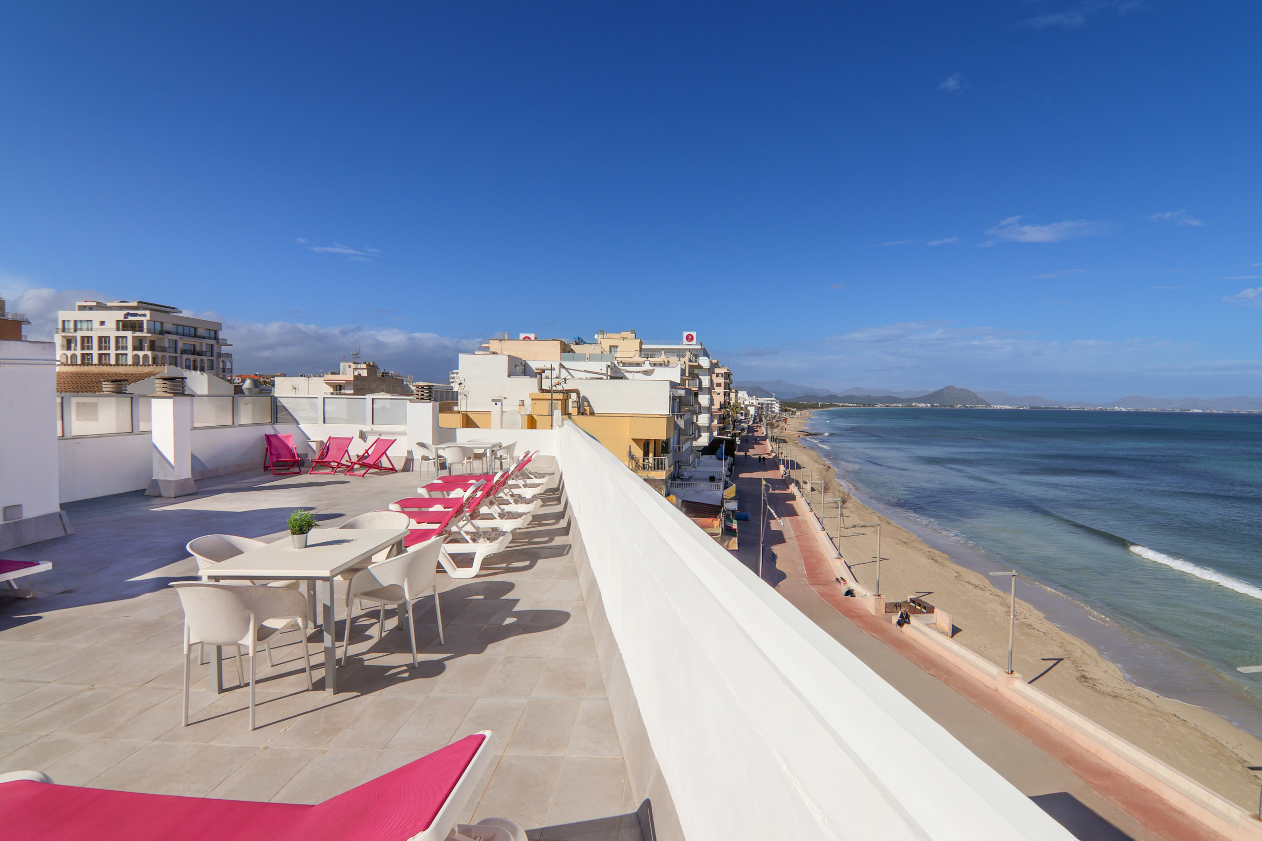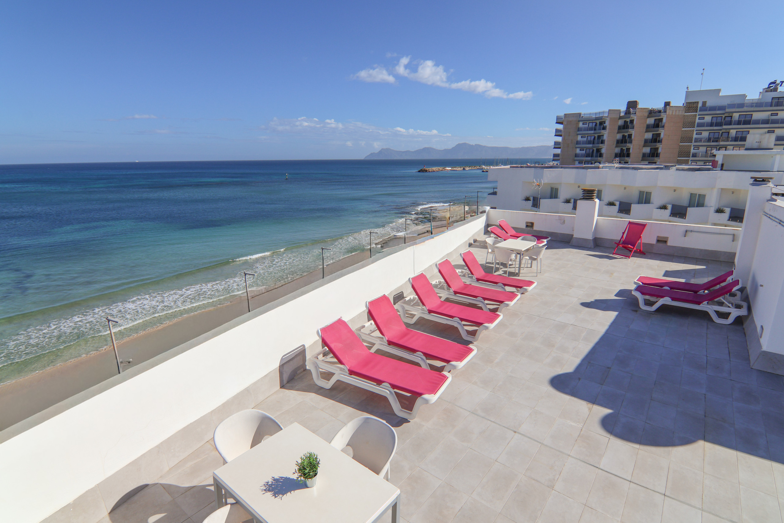 Auf der Dachterrasse finden Sie eine große Terrasse mit spektakulären Ausblicken auf die Bucht von Alcúdia. Der Zugang ist gemeinsam, aber jede Wohnung hat ihre eigene Zone und Mobiliar, sodass Sie in Ruhe Sonne tannen, frühstücken oder im Freien zu Abend essen können.