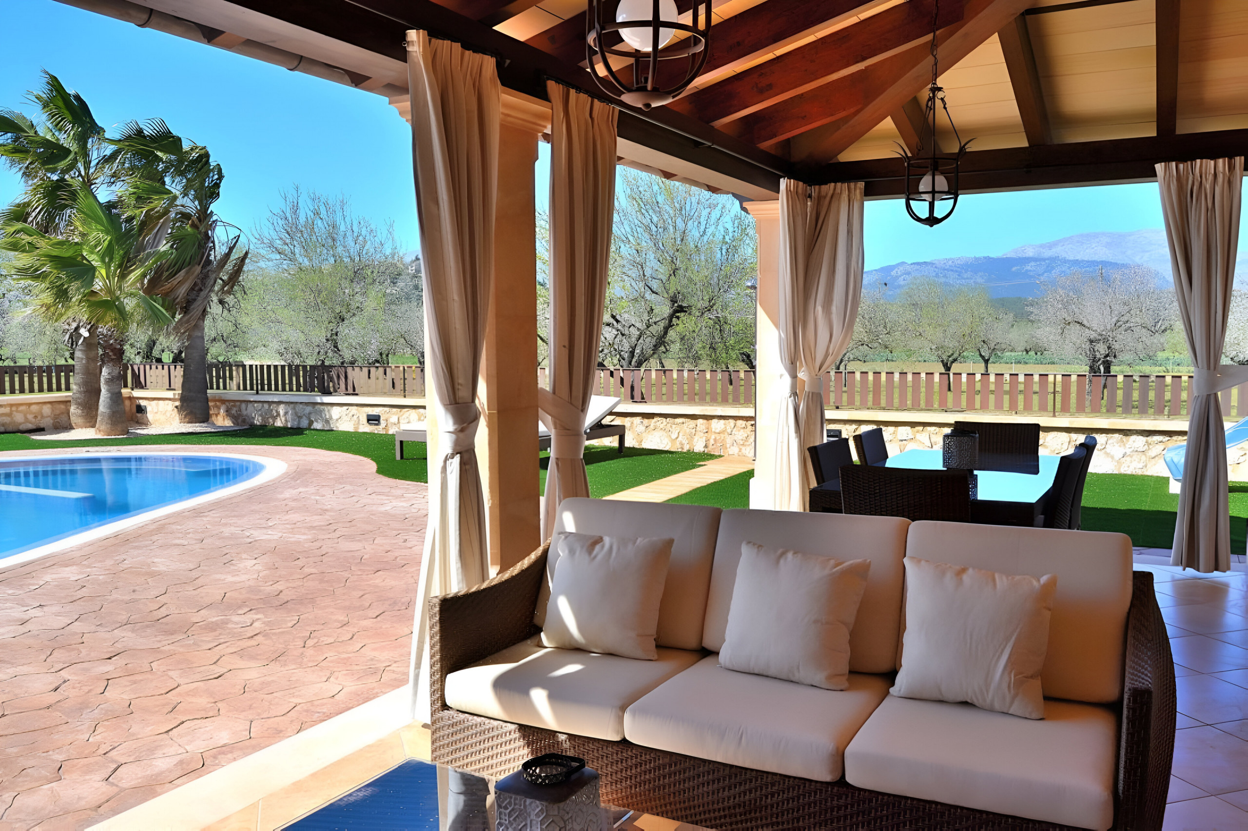 Der grosszügige Terrassenbereich ist komplett mit Naturstein angelegt, genau wie die Fassaden der Finca. Im überdachten Teil der Terrasse befindet sich ein super komfortabler Grillbereich mit zusätzlichem Gasherd und Holzofen. Rustikale Steinbänke mit typisch mallorquinischen Sitzkissen, und 2 grosse Esstische mit Stühlen bieten Platz für eine grosse Reisegruppe, damit alle gleichzeitig zusammen essen können. Der Bauernhof wurde restauriert aber es wurde darauf geachtet das der ursprüngliche Charme erhalten bleibt, was ganz gut an Dekorationselementen und originalen Details zu erkennen ist. Machen sie sich einfach mal auf die Suche und sie werden staunen wie viele antike Elemente erhalten wurden.