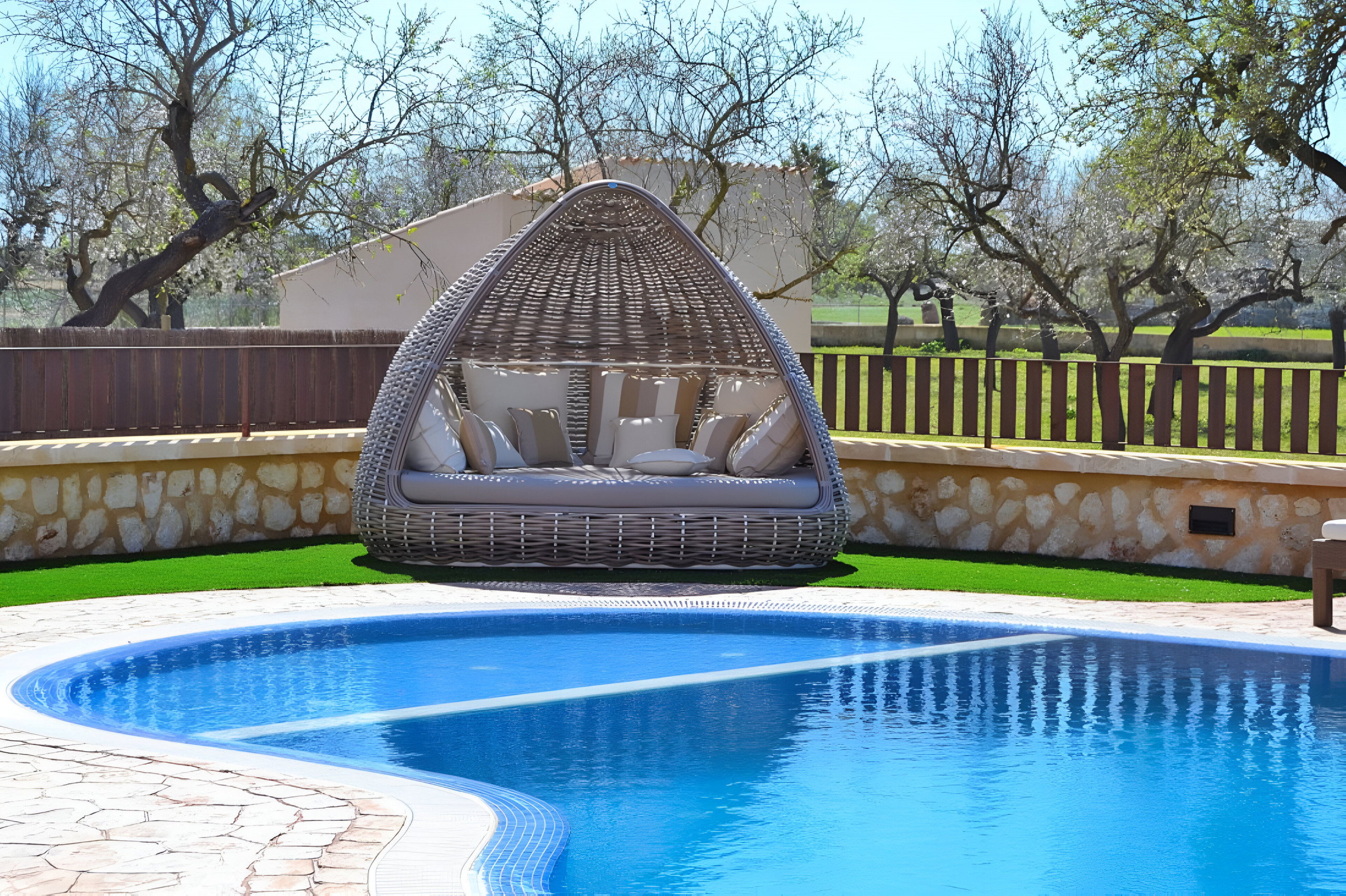 Die Gartenanlage der Finca ist sehr gepflegt und grün angelegt. Die verschieden Baumarten, Kakteen und Palmen inmitten der Grünflächen geben viel Platz zum Erholen, Austoben und Schlendern. Der 42m²grosse Pool ist teichförmig angelegt und und ebenso von viel Rasenfläche und einer schicken Holzterrasse umgeben. Hier lässt es sich herrlich entspannen auf super bequemen Sonnenbetten oder ganz einfach auf einer grossen Decke auf dem Rasen. Zum Holzlook passende Sonnenschirme und hochragende Bäume sorgen für ausreichend Schattenplätze, während man der schönen Ausblick, Naturlandschaft wohin das Auge reicht, geniesst.