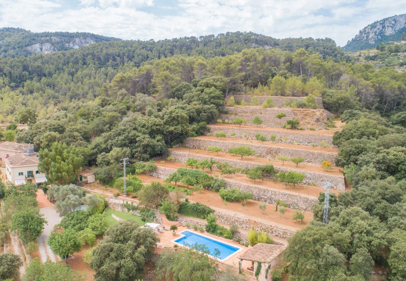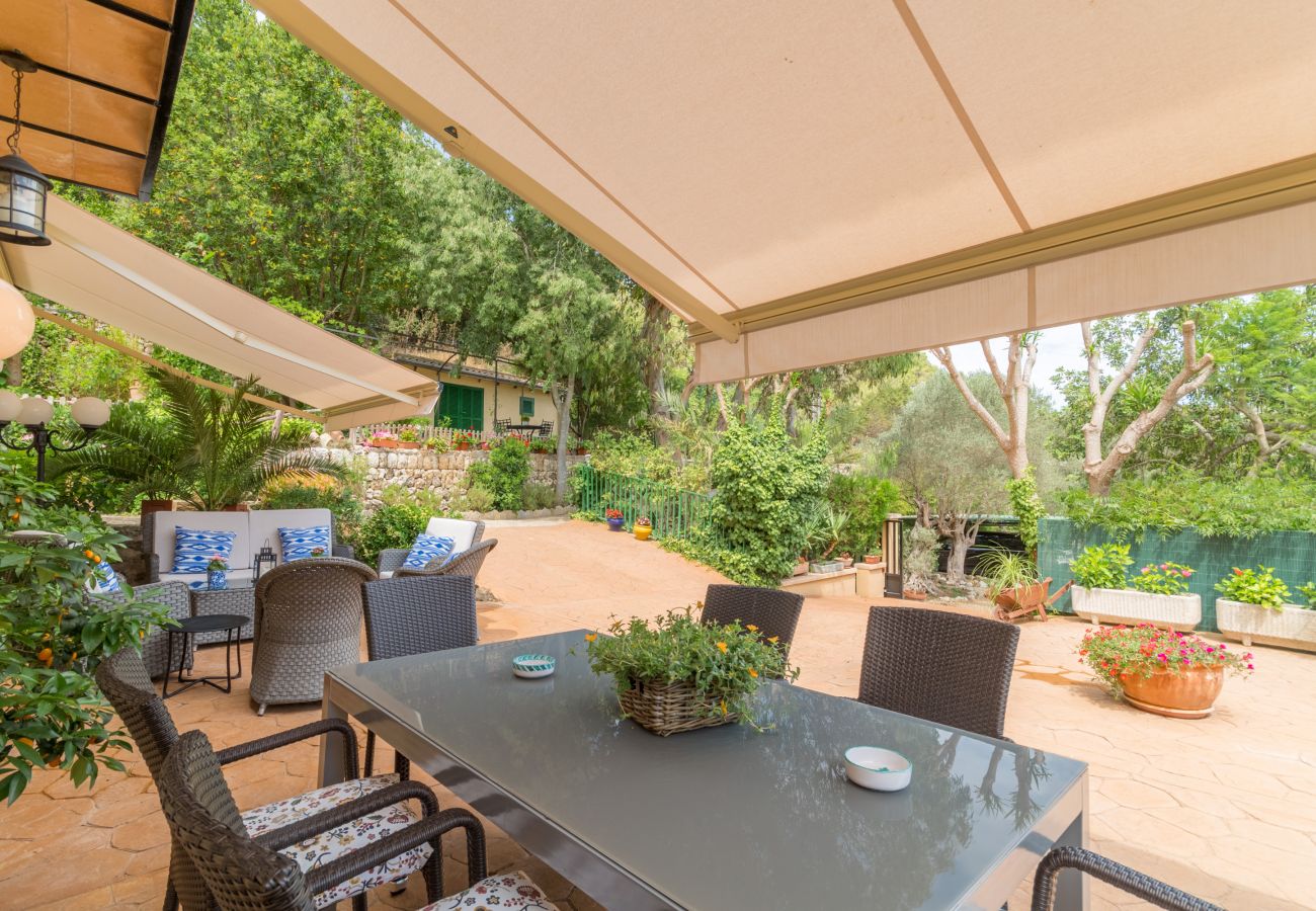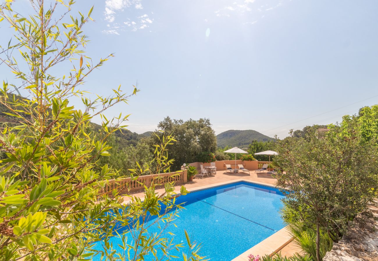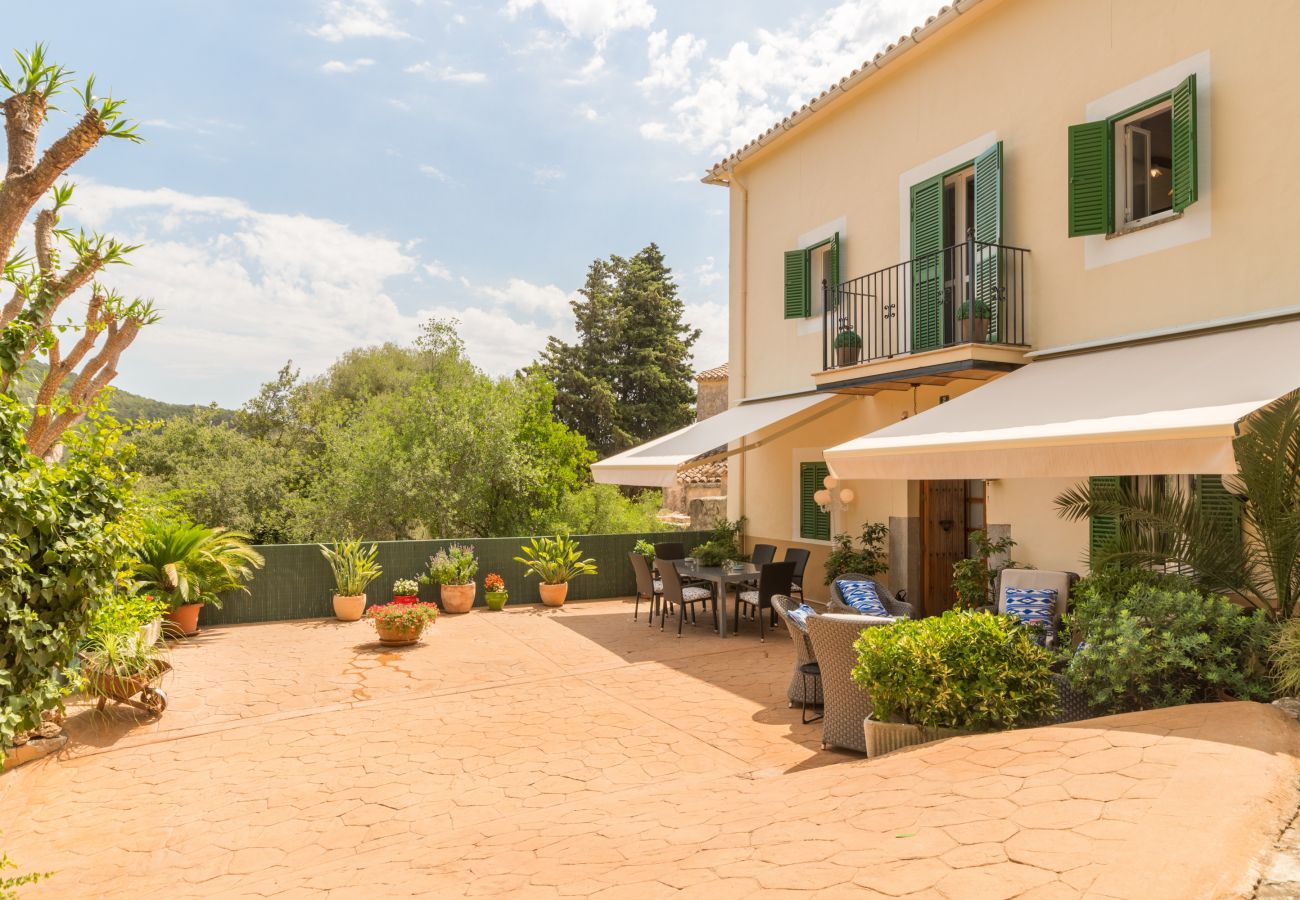 Das Ferienhaus "Aire Can Pieres" heißt Sie mit einem großzügigen Parkplatz und einem beeindruckenden privaten Pool willkommen. Der Poolbereich ist von lebhaften Blumen und Pflanzen umgeben und bietet eine Außendusche, ein komplettes Badezimmer im Poolhaus, bequeme Sonnenliegen und einen schattigen Sitzbereich. Die Terrasse ist mit Markisen überdacht und verfügt über einen Esstisch und Loungemöbel, ideal für Mahlzeiten oder Entspannung. Außerdem gibt es einen gemauerten Grill und ruhige Plätze unter den Bäumen, an denen Sie die Aussicht auf die terrassierte Landschaft genießen können.
