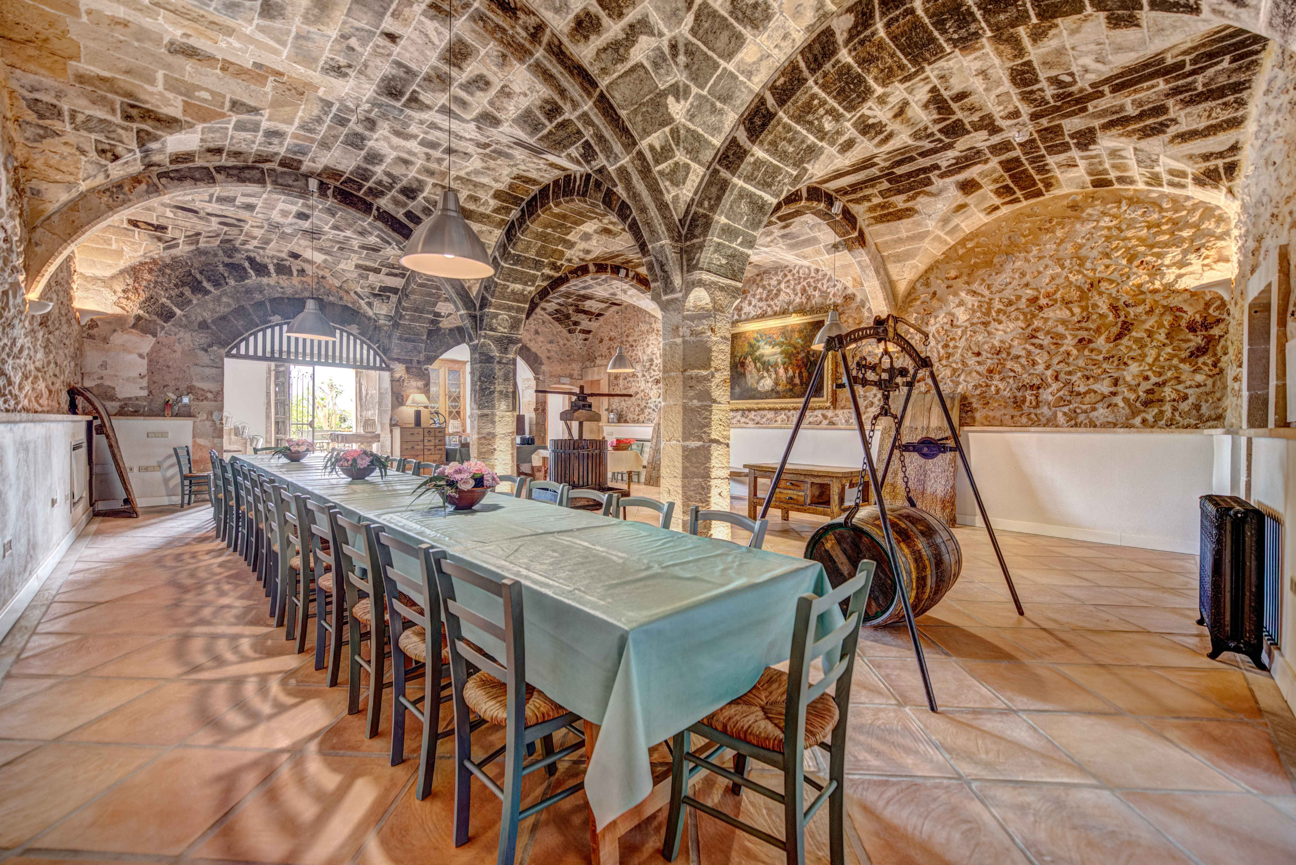 Das Erdgeschoss der Finca beherbergt den großen Keller/Essbereich mit seinen originalen Gewölben und die alte Kapelle, die jetzt in einen Mehrzweckraum umgewandelt wurde. Darüber hinaus gibt es verschiedene Zimmer, die mit einem Projektor, Monitor, Whiteboards, einem Fitnessstudio und einem großen Spiel- und Partyraum ausgestattet sind, ideal für Meetings, Retreats, Feierlichkeiten und Veranstaltungen.