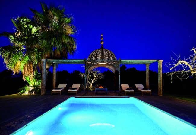 Im Freien dreht sich das Leben um den Salzwasserpool, umgeben von Sonnenliegen und einer Dusche zwischen Olivenbäumen, die die Frische des Bades verlängert. Lebendige Farben in Poufs und Sitzgelegenheiten mit Formen riesiger Blumen verstärken die orientalische und fröhliche Atmosphäre des Anwesens.