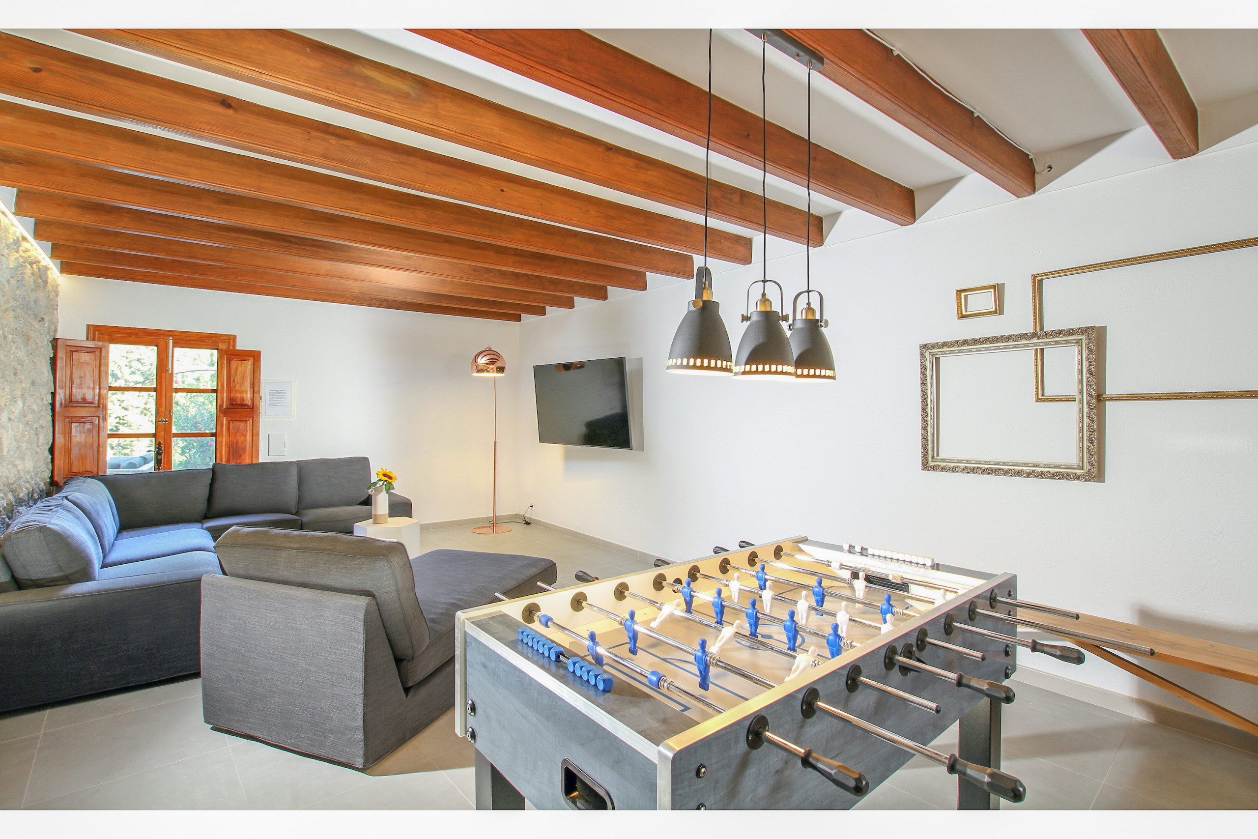 Im Erdgeschoss befindet sich ein geräumiger Freizeitraum, in dem Sie Tischfußball spielen oder auf dem großen bequemen Sofa mit Chaiselongue sitzen und Filme auf dem beeindruckenden 65-Zoll-Bildschirm genießen können. Der Smart-TV ist mit einer drahtlosen Internetverbindung ausgestattet.