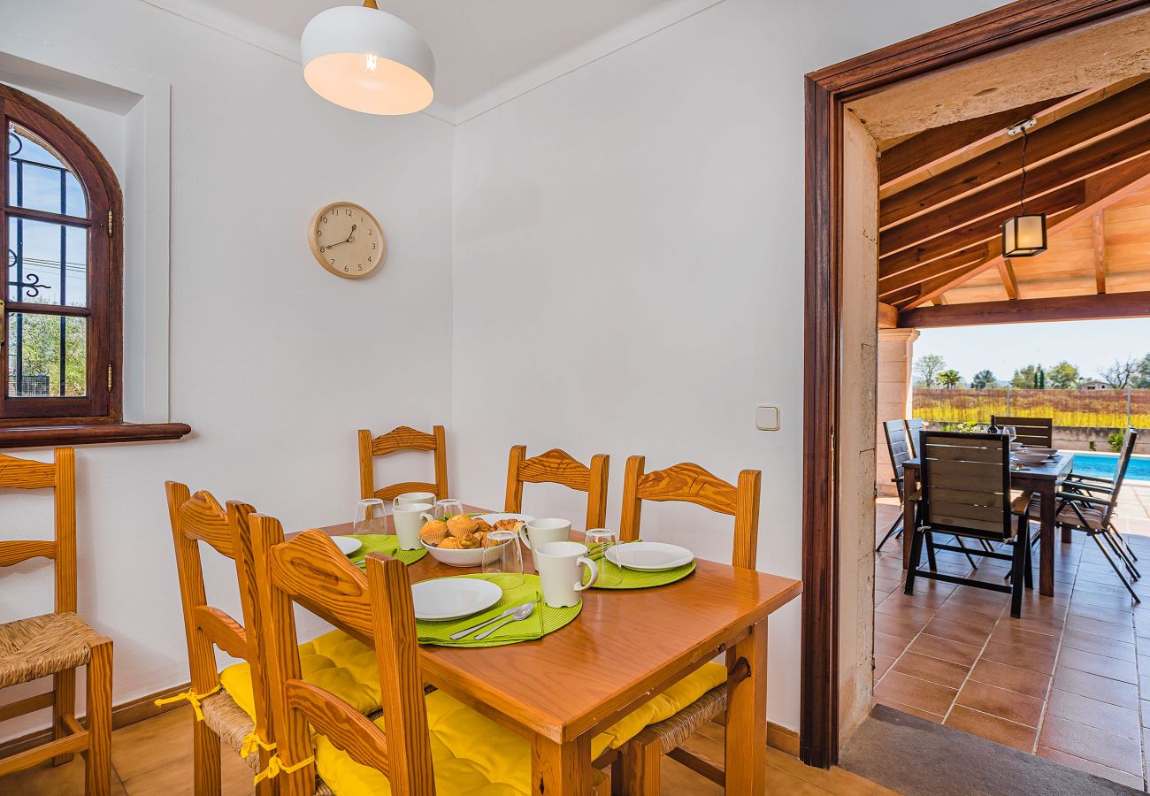 Die eingeschossige Unterkunft verfügt auf 120qm über drei Schlafzimmer, einen geräumigen Wohn- und Essbereich, sowie eine moderne Einbauküche. Somit können hier maximal 6 Personen komfortabel untergebracht werden. Die Räumlichkeiten sind hell und freundlich und im typisch mallorquinischen Stil dekoriert. Eine bequeme Sitzgarnitur lädt zum Verweilen vor dem Fernseher mit SAT TV. Für mehr Unterhaltung sorgen ein CD und ein DVD PLayer. Am großen Esstisch mit edel verarbeiteten Stühlen können Sie gemütlich speisen. Die offene Küche mit Frühstücksbereich ist mit modernen Geräten ausgestattet. Somit finden Sie hier einen Geschirrspüler, eine Mikrowelle, eine Waschmaschine, einen elektrischen Herd mit Cerankochfeld und Backofen so wie eine Kühl- und Gefrierkombination. Auch moderne Küchenutensilien wie Kaffeemaschine, Toaster, und Wasserkocher stehen zu Ihrer Verfügung bereit, so dass Sie sich optimal selbst versorgen können.