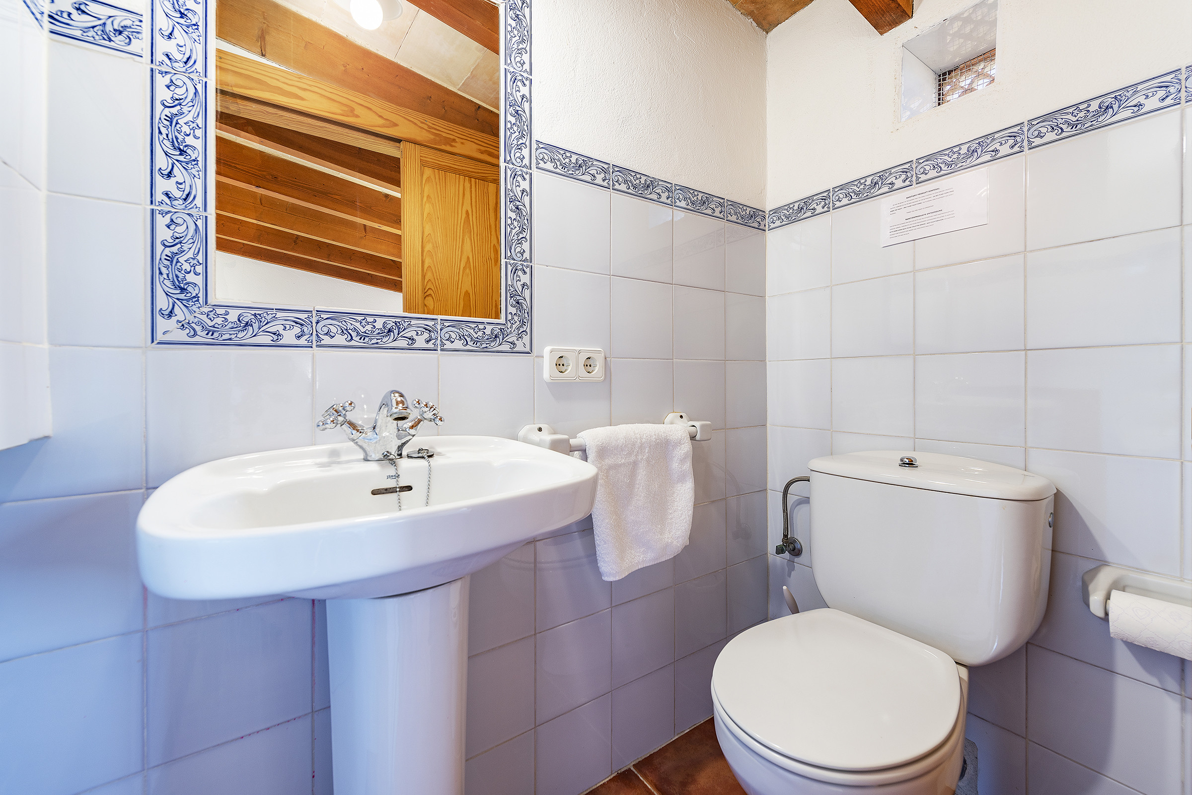 Direkt von der Küche aus gelangen Sie zu den beiden Schlafzimmern, eines mit zwei Einzelbetten und eines mit einem Doppelbett ausgestattet. Diese sind funktionell mit Schränken und Nachttischchen möbliert. Über einen kleinen Flur kommt man zu den beiden Bädern, ein Dusch- und ein Wannenbad. Auch verfügen diese jeweils über ein Waschbecken und ein WC. Das dritte Schlafzimmer befindet sich im Turm, daher auch der Name der Finca - La Torre. Diesen Bereich erreichen Sie vom Wohnzimmer über eine Treppe. Hier erwartet Sie das dritte Schlafzimmer mit zwei Einzelbetten. Eine kleine Tür bietet Zugang zum Außenbereich, von wo aus Sie über eine Wendeltreppe auf die Turmspitze gelangen. Sie genießen von hier aus den atemberaubenden Blick über die Landschaft Pollencas. Besonders romantisch ist es an sternenklaren Nächten den Himmel zu betrachten. Abends können Sie der untergehenden Sonne zusehen und dem aufgehenden Mond entgegenblicken.