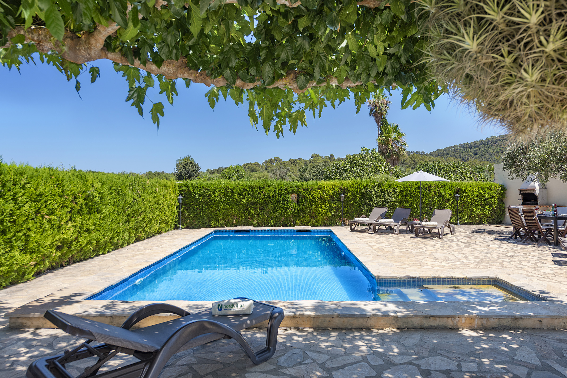 Das schmucke Landhäuschen ist im traditionellen Stil erbaut und bietet auf 120gm Wohnfläche Platz für 6 Personen. Inmitten einer idyllischen Landschaft, nur 4km von der Altstadt Pollencas entfernt, verbringen Sie hier einen komfortablen Urlaub und entspannen vom alltäglichen Stress. Das 6.000qm große Grundstück beinhaltet einen hübsch angelegten Garten mit mediterranen Pflanzen und farbenfroh blühenden Blumenbeeten. Über einen kleinen Pfad gelangen Sie vom Pool aus zum überdachten Grillplatz mit gemauertem Grill. Am gemütlichen Esstisch aus Teakholz finden 6 Personen ausreichend Platz. Einem geselligen Grillabend steht somit nichts mehr im Wege. Auf der mit Rasen bepflanzten Fläche rund um den 8m x 4m großen und 1,80m bis 1,10m tiefen Pool, können gemütliche Liegen aufgestellt werden. So genießen Sie bei schönem Wetter die mallorquinische Sonne in vollen Zügen. Direkt am Haus angebaut befindet sich eine mit Tisch und Stühlen ausgestattete überdachte Terrasse. Beenden Sie hier den Tag bei einem Gläschen Wein oder frühstücken am Morgen mit Blick auf die Garten- und Poollandschaft.