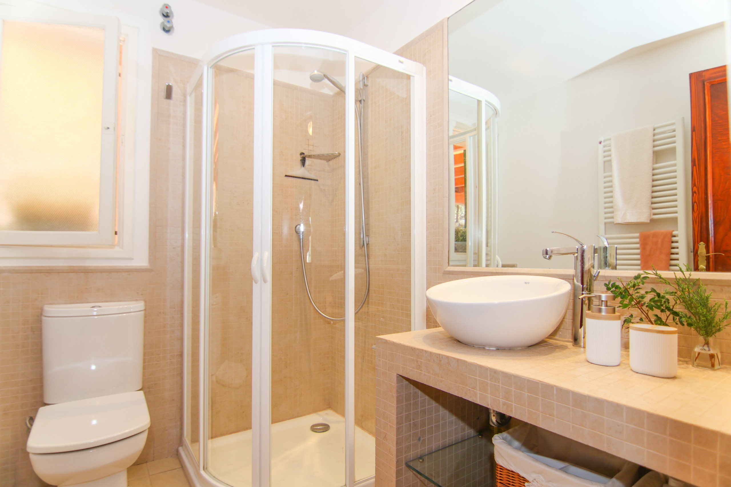 Im Inneren des Hauses gibt es zwei Schlafzimmer, eines mit Doppelbett und eines mit zwei Einzelbetten, sowie ein gemeinsames Badezimmer. Das dritte Schlafzimmer mit zwei Einzelbetten und eigenem Bad befindet sich neben der Außenterrasse und bietet einen Raum mit zusätzlicher Unabhängigkeit innerhalb des Anwesens. Es gibt auch ein drittes komplettes Badezimmer in der Poolbereich.