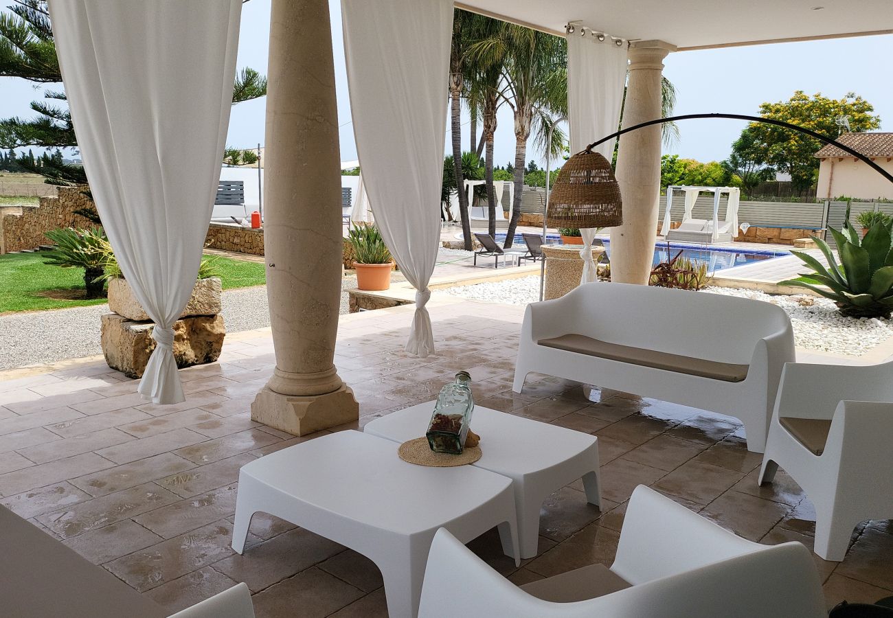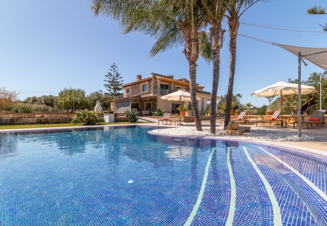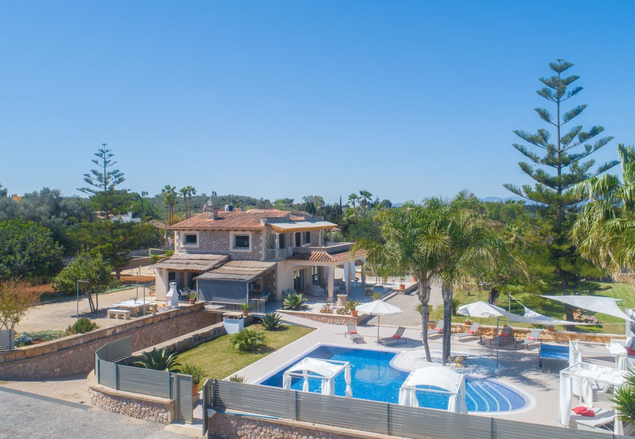 5StarsHome, der führende Anbieter von Ferienvermietungen auf Mallorca und Ibiza, bietet Ihnen diese prächtige Villa auf einem weitläufigen Grundstück von 8.000 m² mit Oliven- und Palmenbäumen. Der gesamte Hof ist mit einem großen Stahltor umzäunt, das Zugang zu diesem vielfältigen Gartenparadies bietet. Zu den Annehmlichkeiten gehören grüne Rasenflächen, ein Kinderspielplatz, Beachvolleyball- und Fußballfelder, Tischtennis und ein riesiger Salzwasserpool (10m x 12m) mit Liegestühlen, Sonnenschirmen, einer Außendusche und einem Chill-out-Bereich unter einem mediterranen Sonnensegel. Das Haus bietet eine geräumige, überdachte Terrasse mit bequemen Gartenmöbeln, perfekt für Familienessen am langen Tisch.