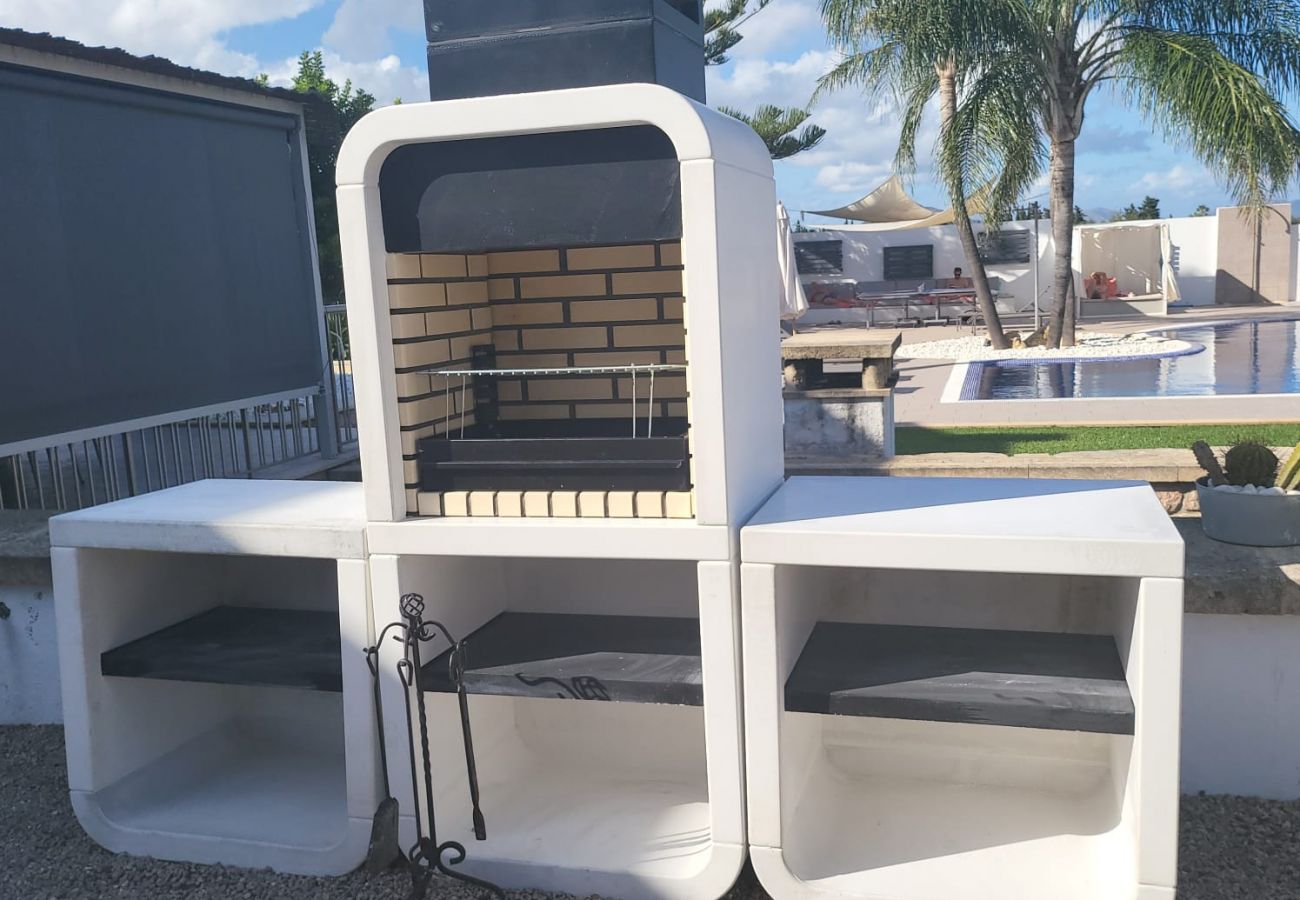 Prächtige Außenzone, überdachte Terrasse mit bequemem Mobiliar zum Genießen des schönen Wetters von Mallorca, Pool, Sonnenliegen und Grill.