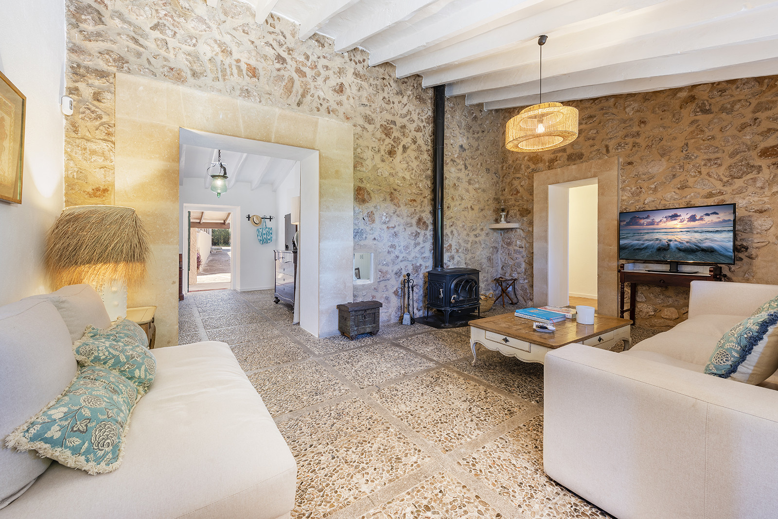 Das Haus ist ebenerdig gebaut, mit Fliesenböden, weißen Wänden und mallorquinischen Möbeln aus dunklem Holz.