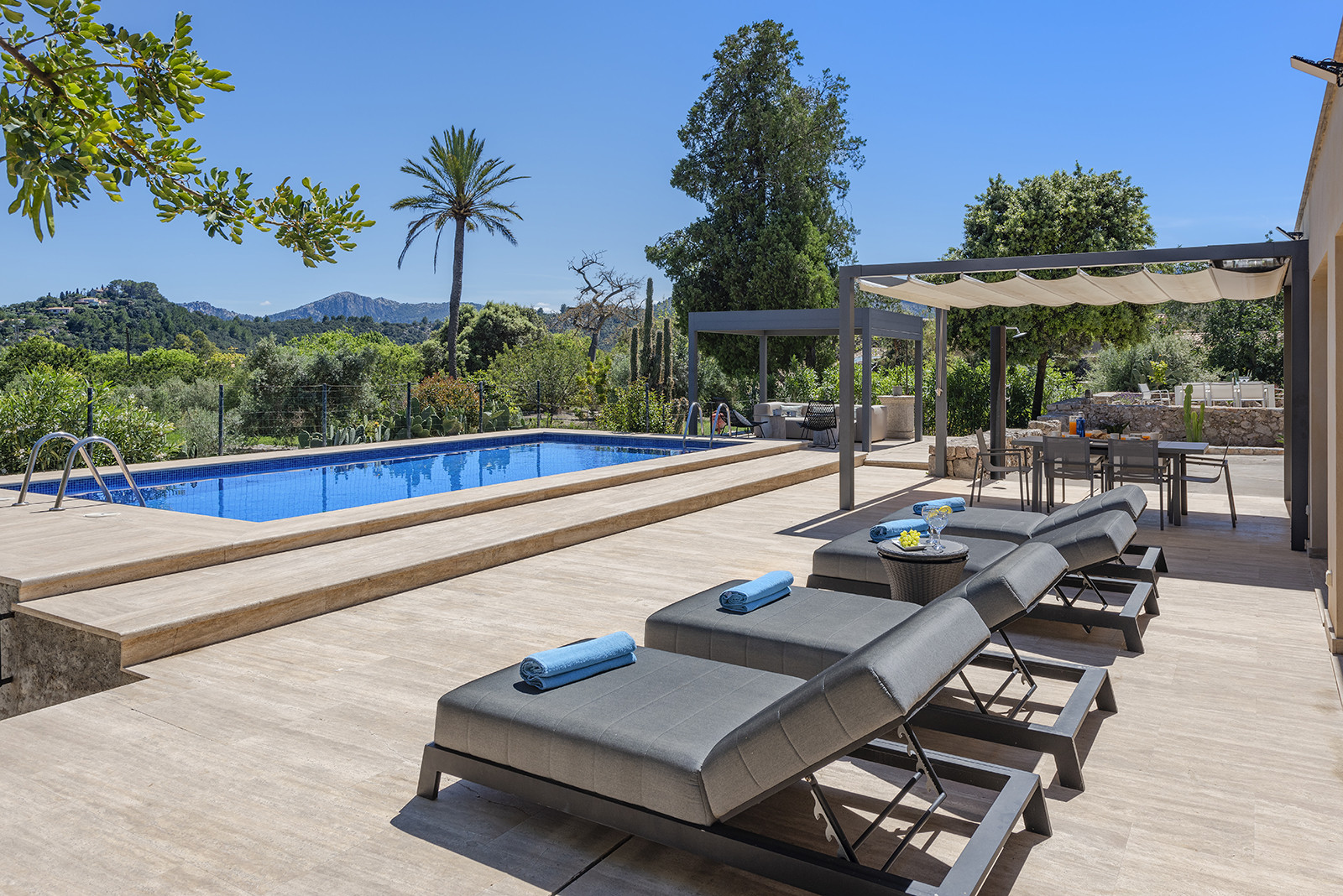 Draußen wartet ein großer privater Garten auf Sie mit einem spektakulären Swimmingpool, umgeben von Sonnenliegen und Outdoor-Möbeln, um die Mallorca-Sonne zu genießen. Die Immobilie verfügt auch über einen Grillbereich und einen gemütlichen Chill-out-Bereich, ideal zum Essen im Freien oder zum Entspannen bei Sonnenuntergang.