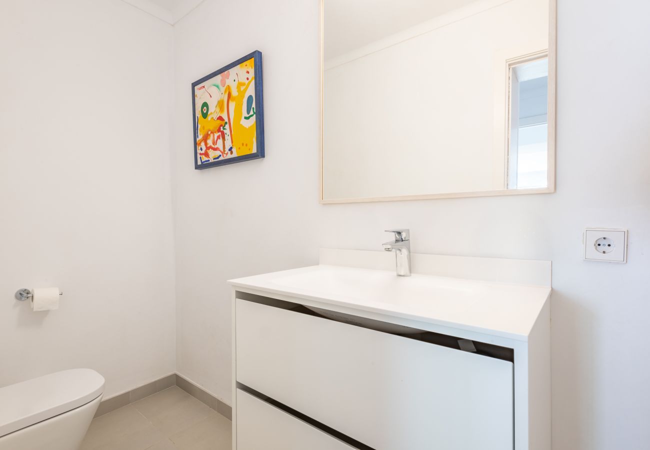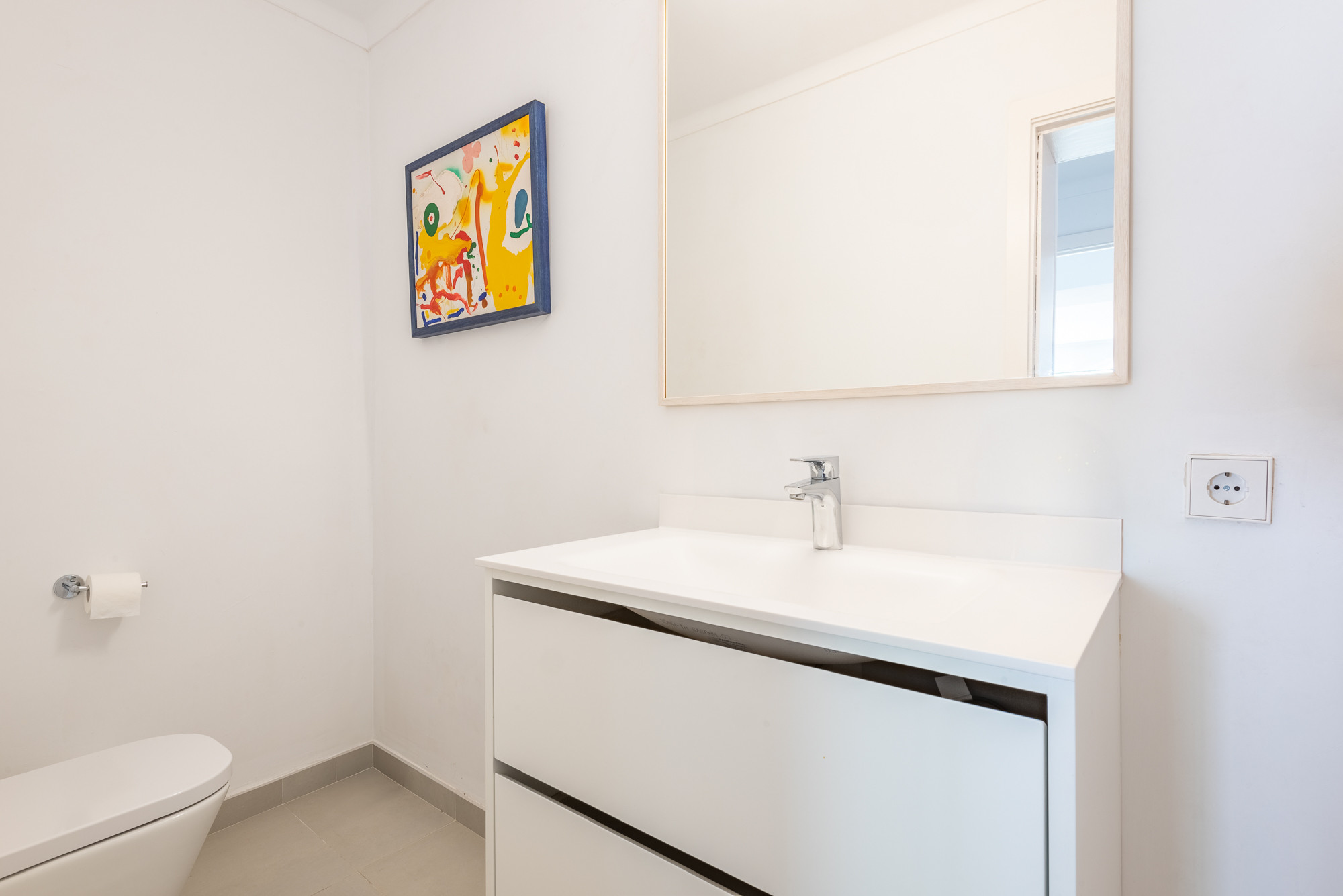 Im Hauptgeschoss, welches man von der unteren Etage sowohl von Innen als auch über eine schöne Außentreppe erreicht, gibt es ein geräumiges Wohnzimmer mit Meerblick, ausgestattet mit einem großen Sofa vor dem Fernseher. Das Wohnzimmer hat Zugang zu zwei schönen Terrassen. Auf der Hauptterrasse -mit Blick auf den Hafen von Porto Cristo- befindet sich der private Pool und Grillplatz mit einem überdachten Bereich und einem Tisch für 8 Personen, wo Sie beim Frühstück auf das Meer blicken können. Die andere Terrasse neben dem Eingang ist nach Süden ausgerichtet und mit entsprechenden Möbeln ausgestattet, sie bietet ebenfalls einen herrlichen Blick auf das Meer. Neben dem Esszimmer gibt es eine kleine Toilette. Die Küche, die sich direkt neben dem Esszimmer befindet ist sehr geräumig und komplett ausgestattet mit Backofen, Cerankochfeld, Mikrowelle, Kühlschrank, Gefrierschrank, Kaffeemaschine, Töpfen, Pfannen, Tassen, Gläsern, Tellern, Besteck,… Außerdem befindet sich auf diesem Hauptgeschoss ein Doppelzimmer mit Kingsize-Bett und eigenen Bad mit Dusche.