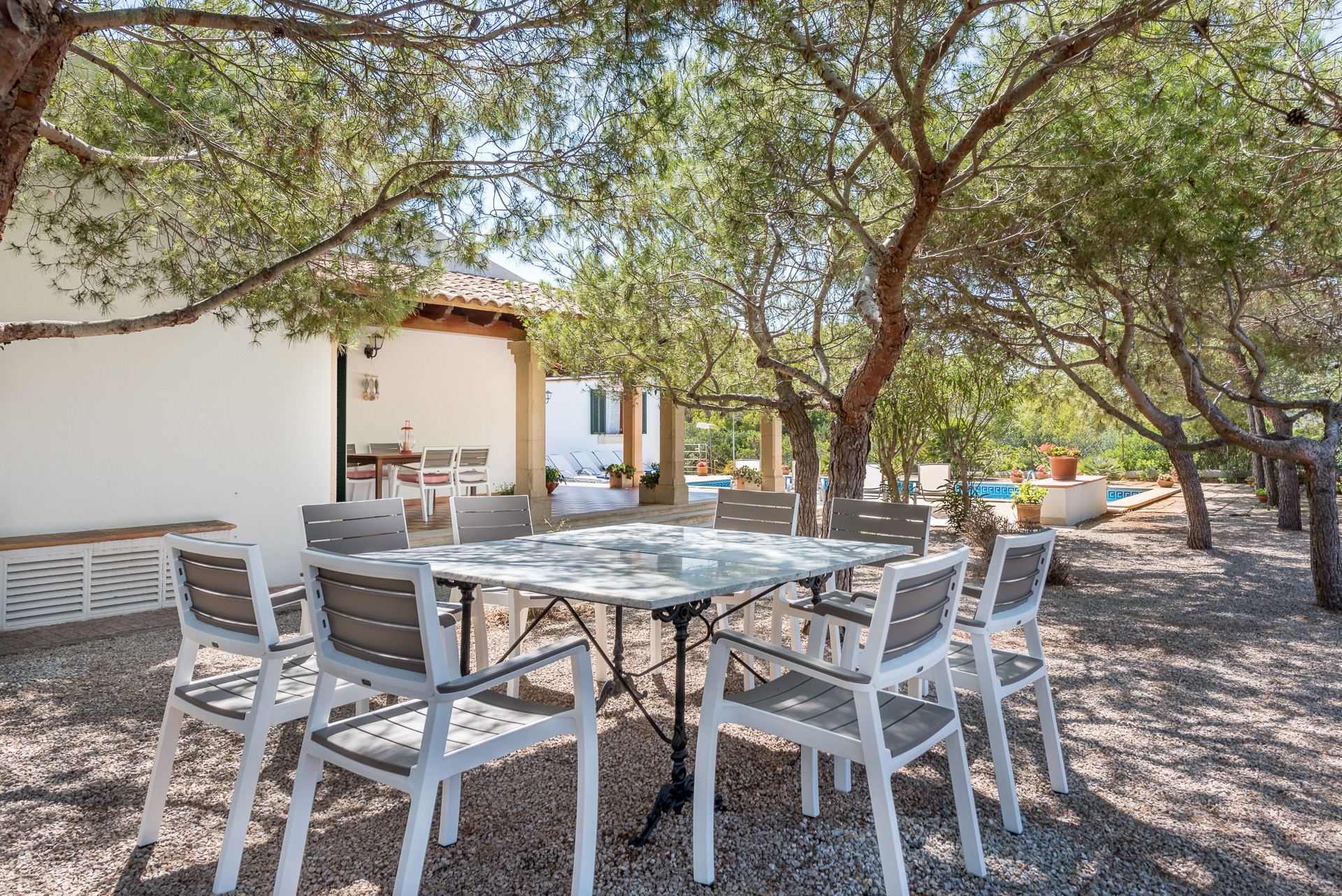 Der Außenbereich des Hauses ist sehr weitläufig. Vom Esszimmer aus gelangt man auf die überdachte Terrasse mit einem Sitzbereich mit Sesseln und einem Esstisch. Neben der Terrasse befindet sich der von Pinien umgebene Pool mit Sonnenliegen. Der Garten hinter dem Haus ist ein sehr schönes Kieferngebiet mit Tischen, weiteren Sonnenliegen und dem Grill.