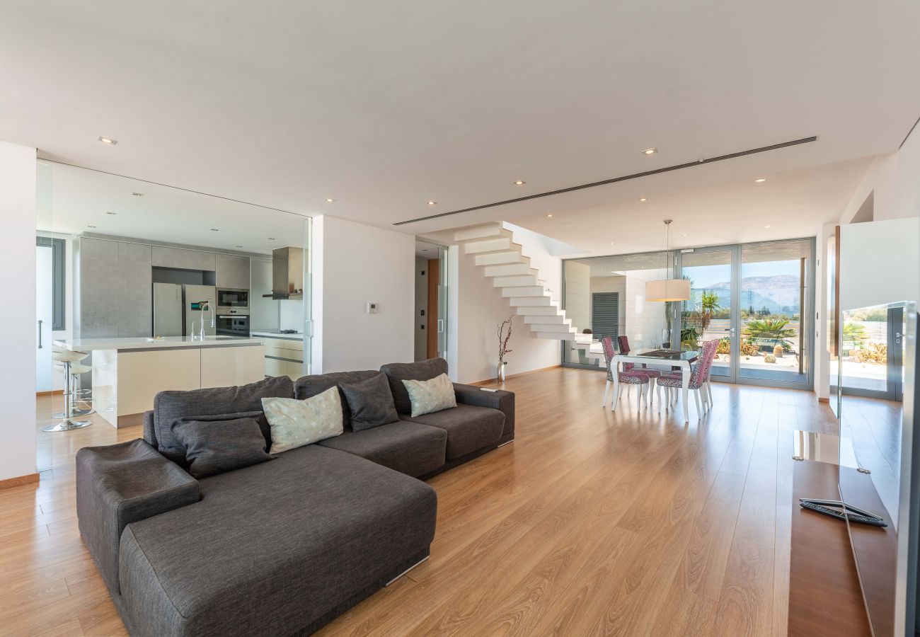 Die Villa ist auf 2 Ebenen aufgeteilt. Im Erdgeschoss befindet sich das lichtdurchflutete Wohnzimmer mit sehr bequemen XXL-Sofa, Sat-TV und extra Esstisch. Von hieraus hat man Zugang zu der vollausgestatteten Designerküche mit moderner Kücheninsel, Barhockern und grossem Esstisch. Alle Geräte sind sehr modern und hochwertig. Während des gemeinsamen Essens geniesst man hier den herrlichen Blick in den Garten und Pool. Alles ist in hellen Tönen mit netten Akzentfarben gehalten. Der Schlafbereich im Erdgeschoss ist auf 3 Doppelschlafzimmer (2 mit Doppelbett 1,80m x 2m, 1 mit 2 Einzelbetten 0,90m x 2m) aufgeteilt. Zu jedem Schlafzimmer gehört hier ein eigenes Badezimmer, entweder mit Whirlpool-Badewanne oder mit Massage Duschsäule. Jedes Badezimmer ist individuell gestaltet, sehr modern und geschmackvoll eingerichtet. Die Schlafzimmer verfügen alle über Einbauschränke und sehr bequemen Betten. Eines der Schlafzimmer hat sogar einen riesigen begehbaren Kleiderschrank, oder besser gesagt Ankleidezimmer auf Grund der Grösse und Komfort. Im oberen Teil der Villa, den man über eine breite Schwebetreppe erreicht, befindet sich ein weiteres, sehr grosses Doppelschlafzimmer mit Doppelbett (2,20m x 2m) und herrlichem Ausblick auf die umliegende Landschaft. Von hieraus hat man noch zusätzlich die Möglichkeit sich auf der stylischen Terrasse zu entspannen. Alle Räume sind mit Schiebetür-Elementen ausgestattet, was ein sehr angenehmes, offenes Raumgefühl schafft. Da das Haus komplett isoliert ist, reicht diese völlig aus um eine absolut angenehme Raumtemperatur zu schaffen, egal ob Sommer oder Winter. Auf Wunsch werden auch zusätzlich Extrabetten, sowie Babybetten und Hochstühle zur Verfügung gestellt.