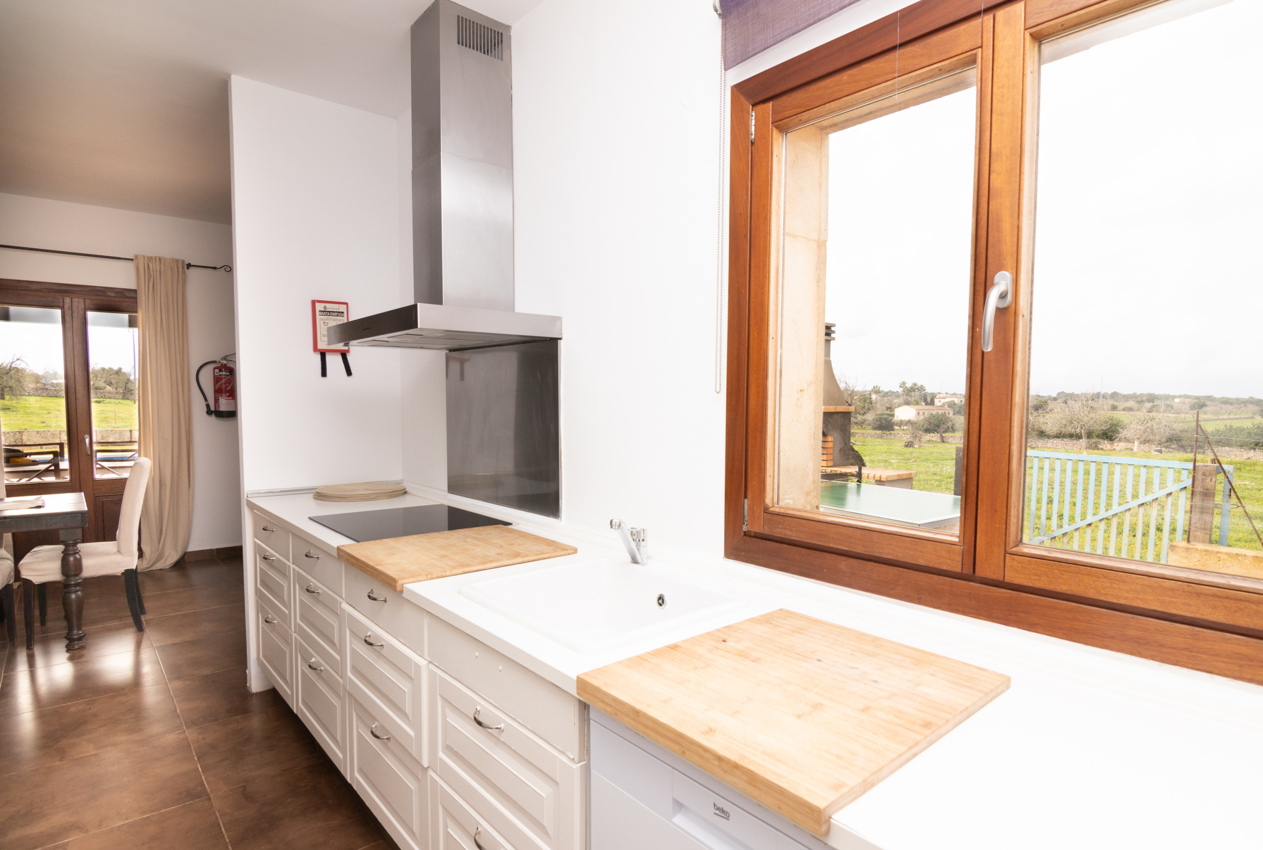 Die offene Fincaküche ist gut ausgestattet und bietet u.a. ein Cerankochfeld und einen Geschirrspüler. Es gibt 3 klimatisierte Schlafzimmer, davon 2 mit je einem Doppelbett und das letztere mit 2 Einzelbetten. Zwei Badezimmer mit Dusche oder Badewanne, eine Waschmaschine, Satellitenfernsehen, Wlan und ein Bügeleisen mit Bügelbrett runden die Ausstattung ab.
