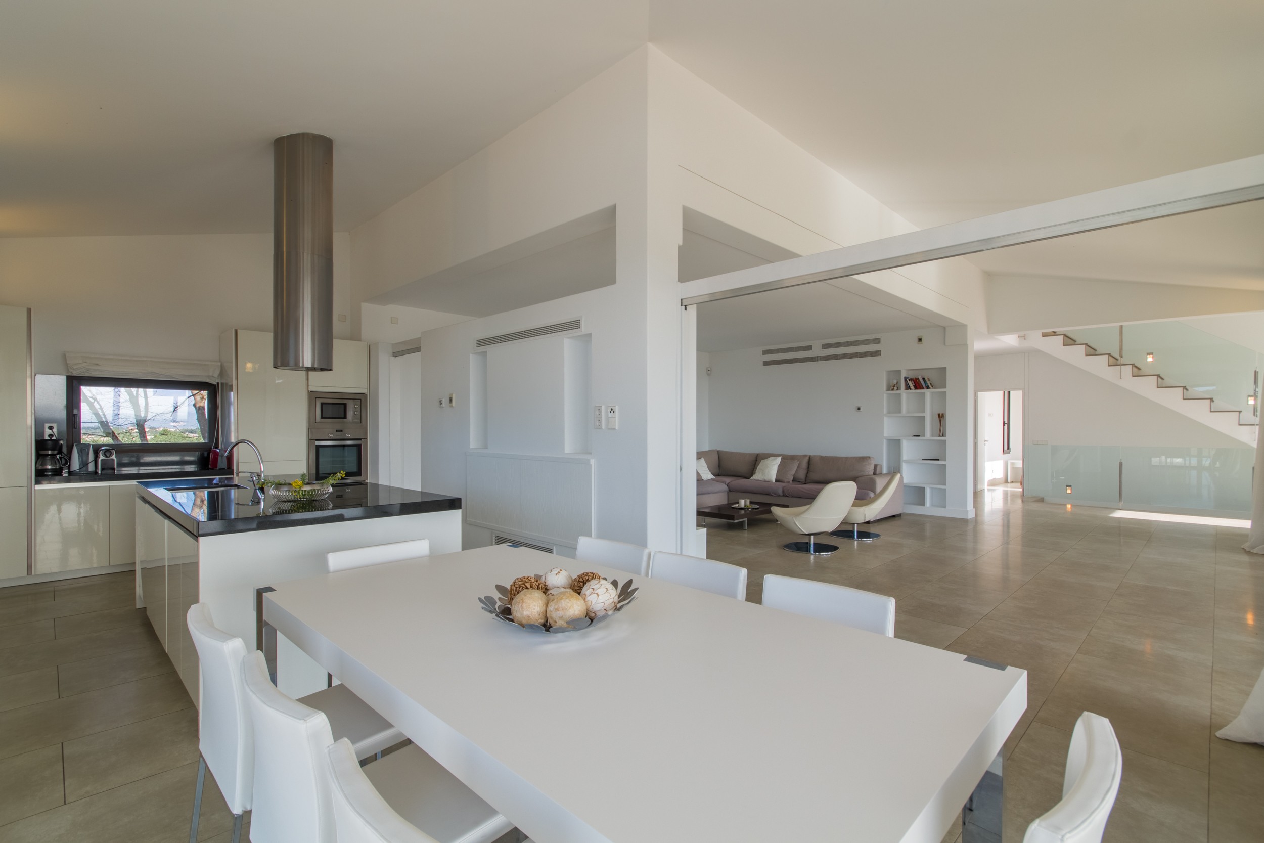 Das Innere beeindruckt durch eine stilvolle weiße Einrichtung, klare Linien und hochwertige Möbel. Im Erdgeschoss befinden sich ein großzügiges Wohnzimmer mit bequemen Sofas und Satellitenfernsehen sowie eine offene, voll ausgestattete Küche, die nahtlos in den Essbereich übergeht. Zwei weitere Schlafzimmer im Obergeschoss bieten Panoramablicke auf die umliegende Landschaft.