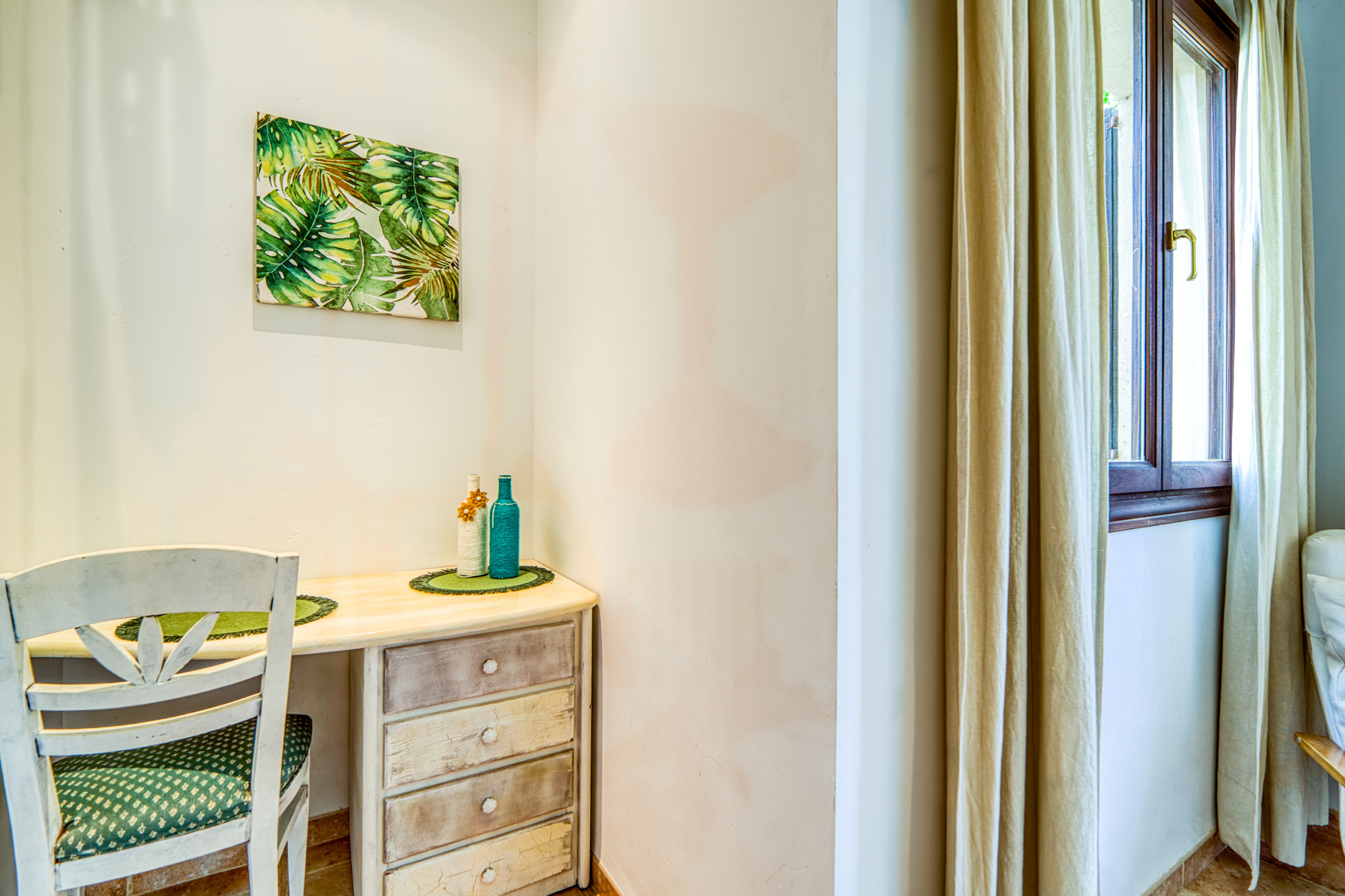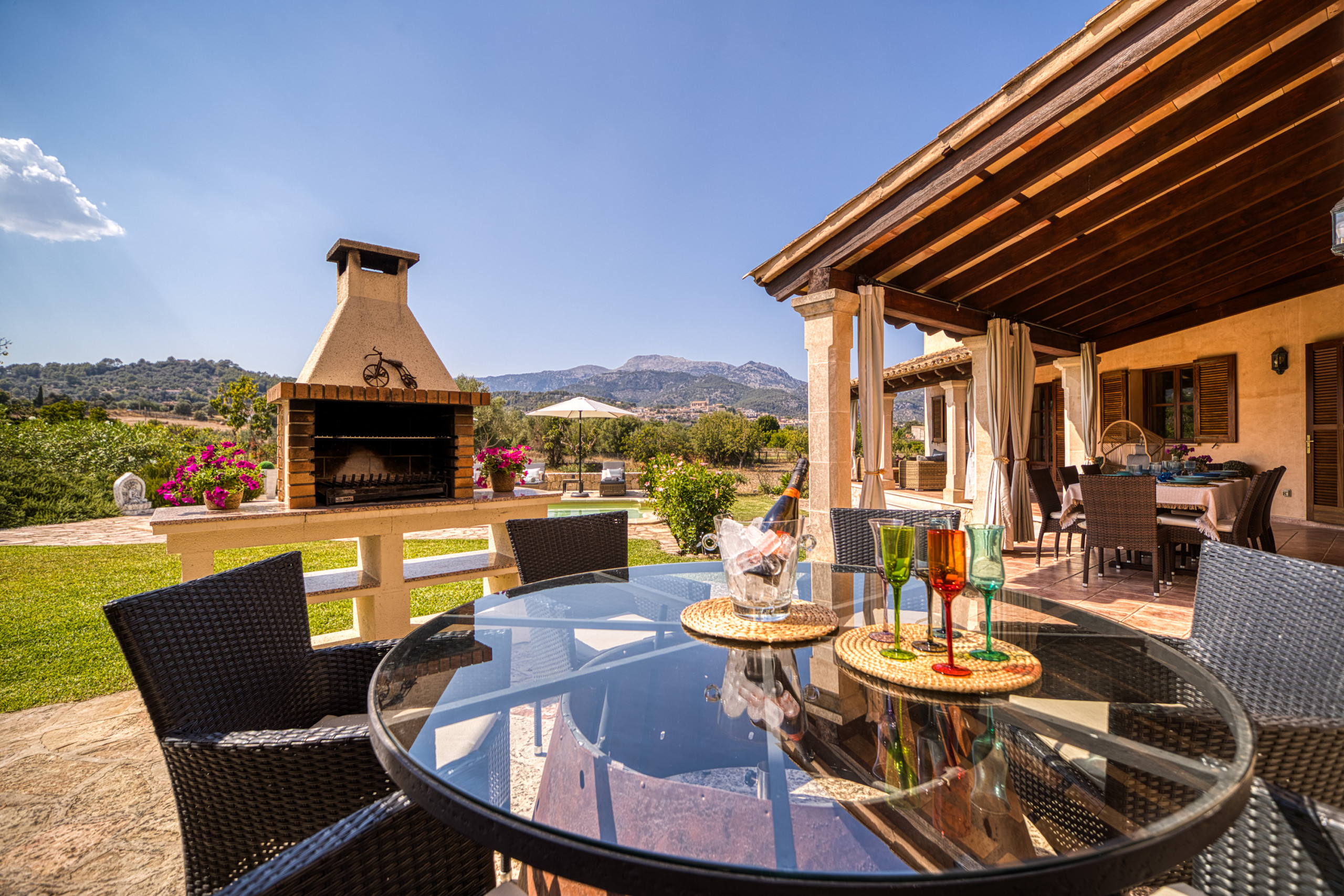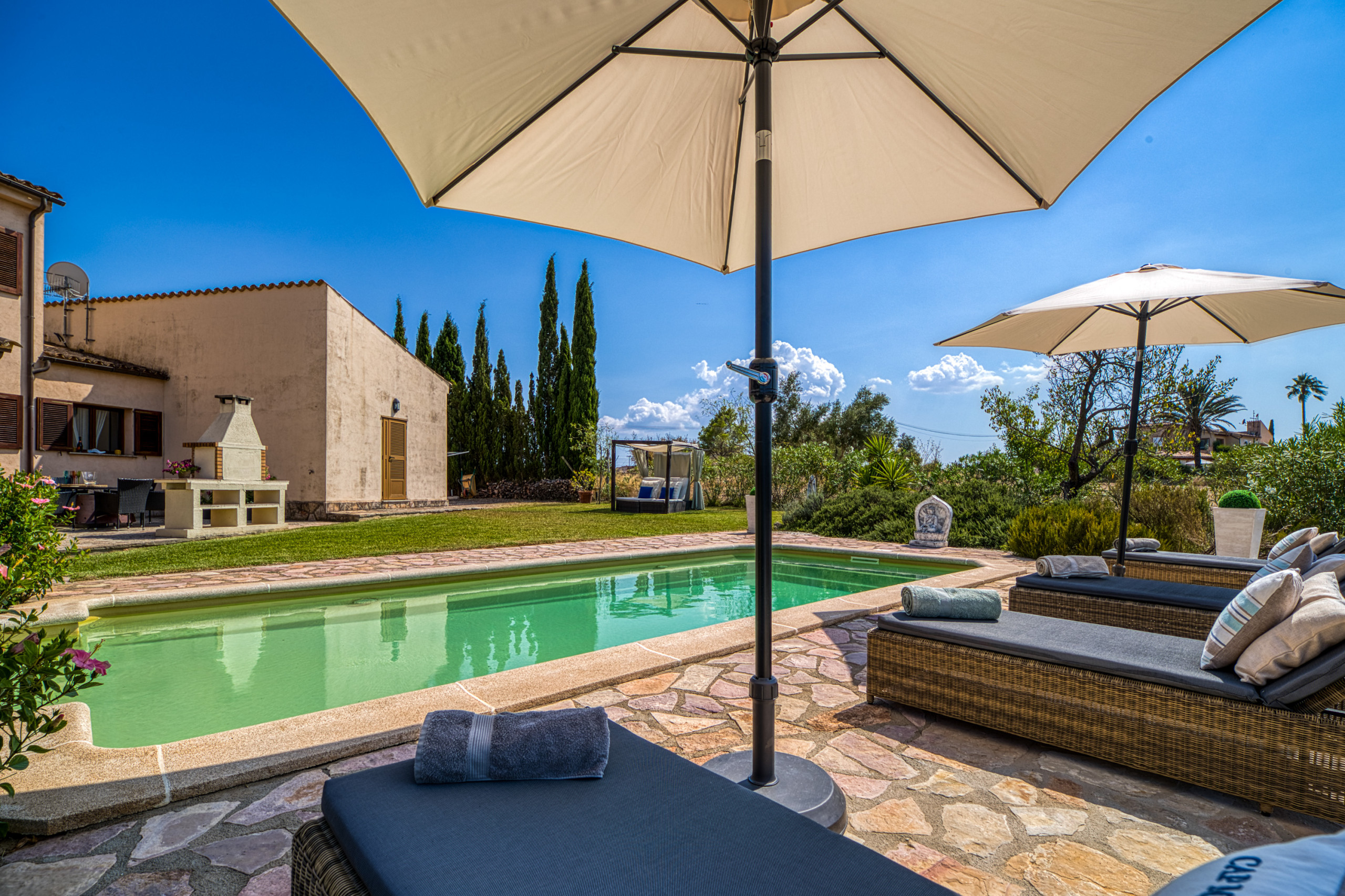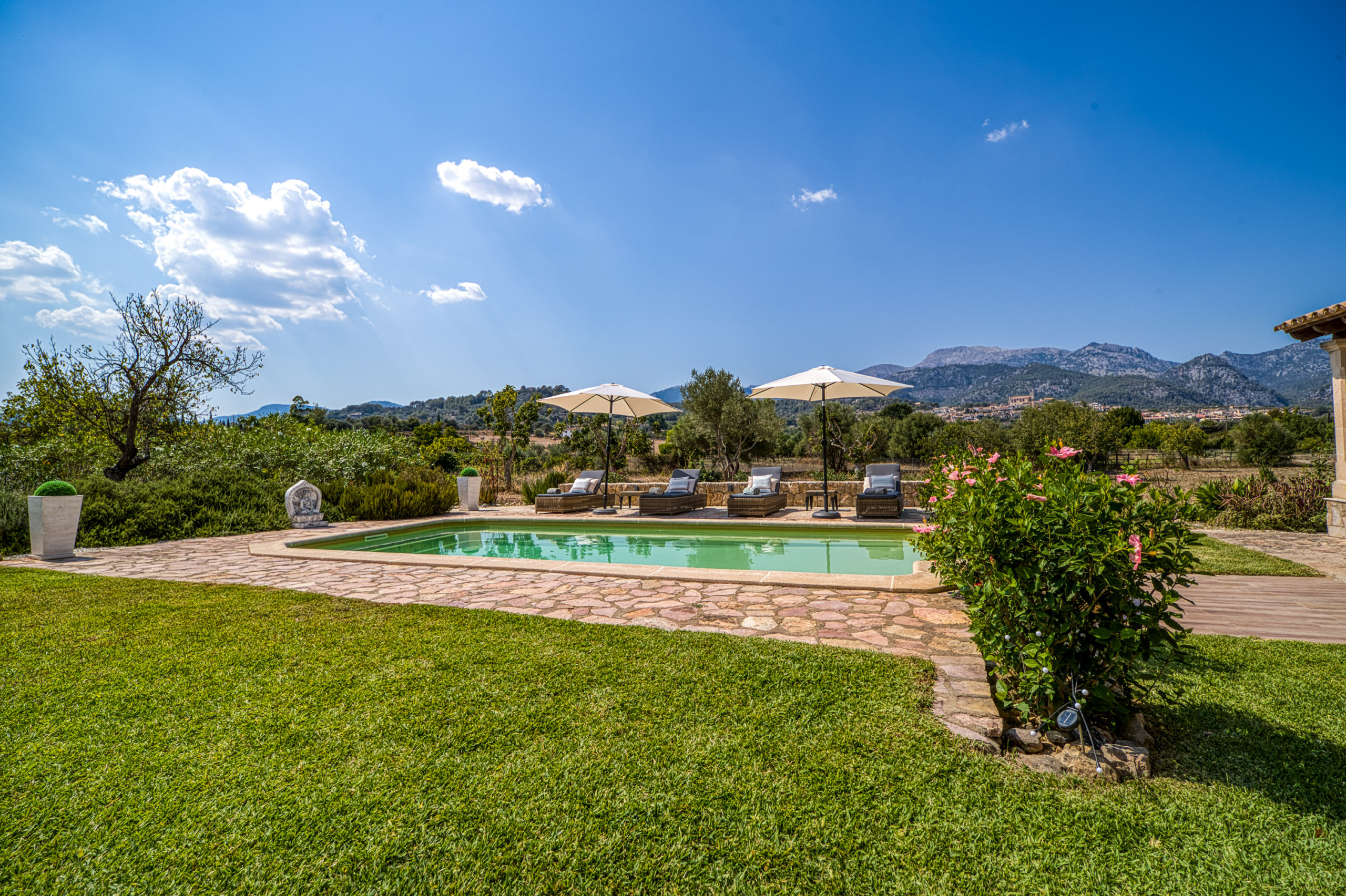 Im Außenbereich erwartet Sie ein großer, eingezäunter Garten mit herrlichem Bergblick. Highlight ist der 8x4 Meter große Pool, umgeben von einer Sonnenterrasse mit Liegestühlen – ideal, um die mallorquinische Sonne zu genießen. Der Grillbereich mit Gartenmöbeln und Picknickzone bietet den perfekten Rahmen für gemeinsame Mahlzeiten und gesellige Stunden. Jeder Winkel ist sorgfältig gestaltet, um Funktionalität mit dem authentischen Flair Mallorcas zu vereinen.