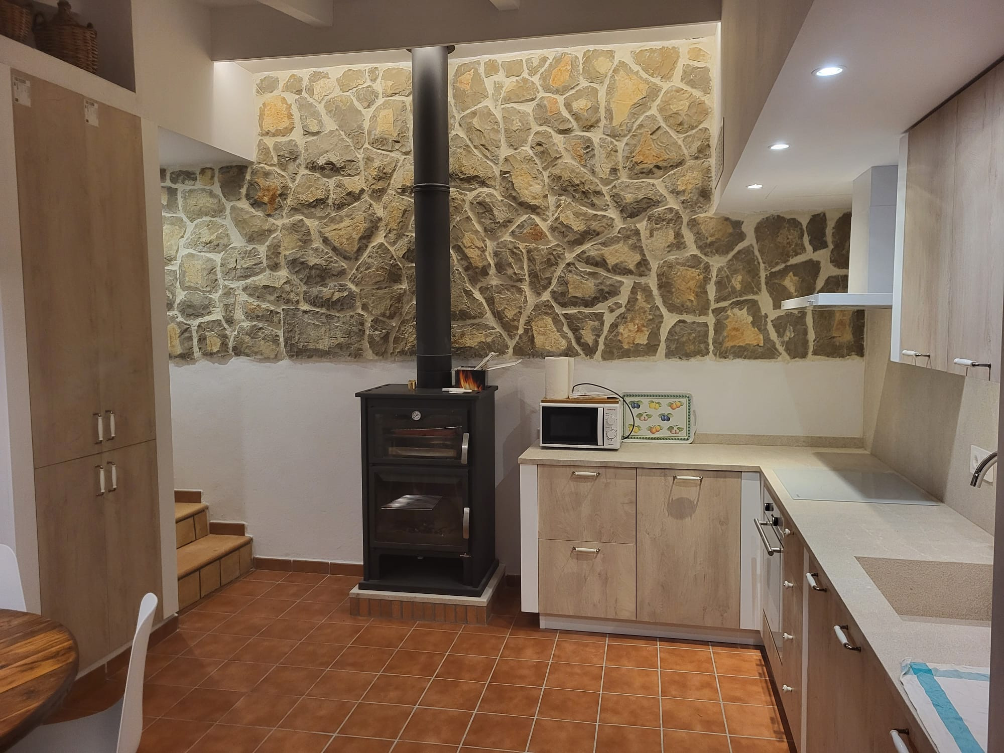 Die separate Hauptküche ist mit Ofen, Gaskochfeld, Mikrowelle, Geschirrspüler und Kochgeschirr ausgestattet und hat direkten Zugang zur Terrasse. Die nebenan liegende Waschküche umfasst Waschmaschine, Bügeleisen und Bügelbrett. Vom Flur aus führt eine Wendeltreppe zu einem Dachboden mit zwei Einzelbetten, Klimaanlage und einem Balkon mit fantastischem Blick auf den Pool und die Berge.