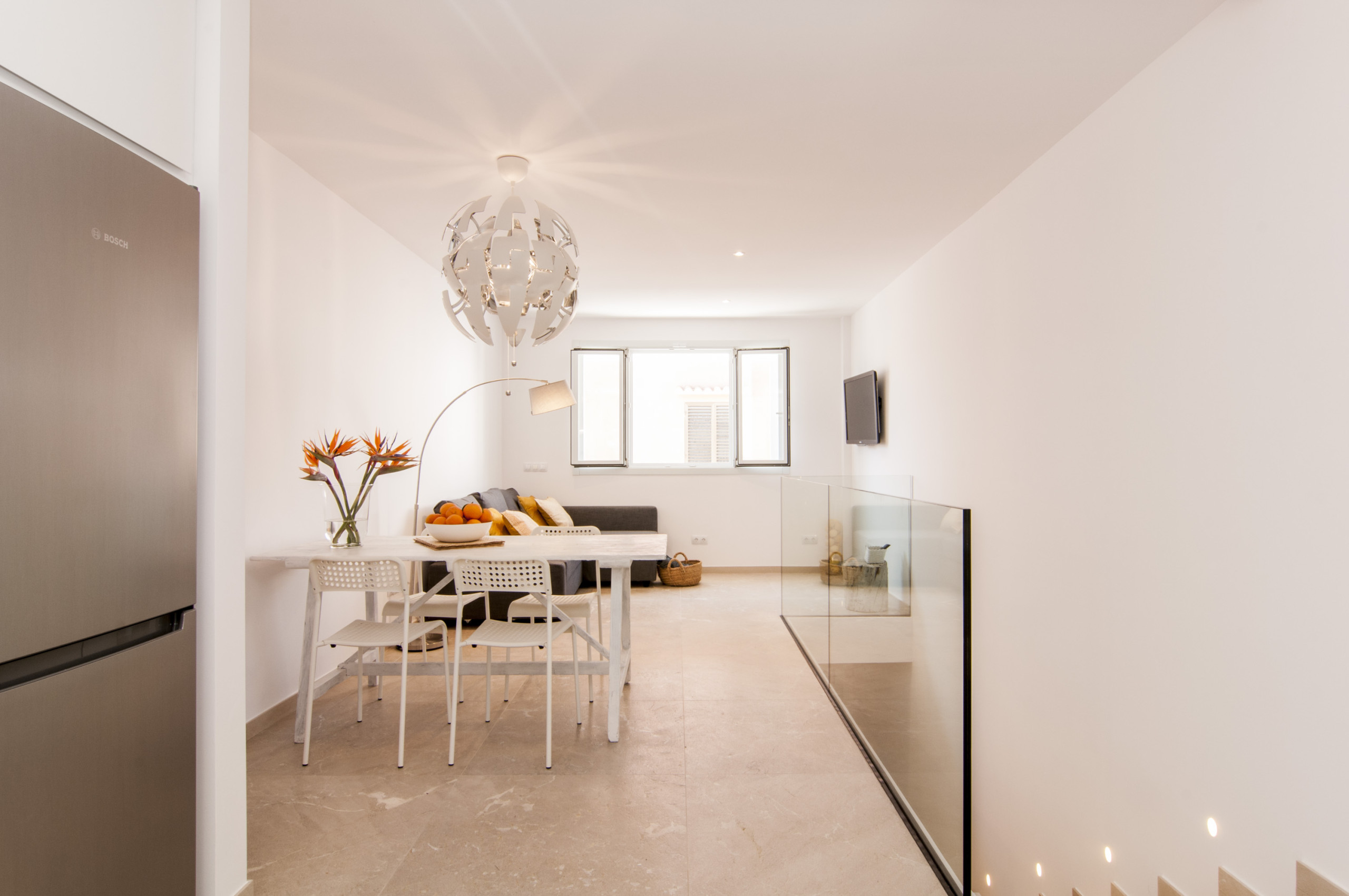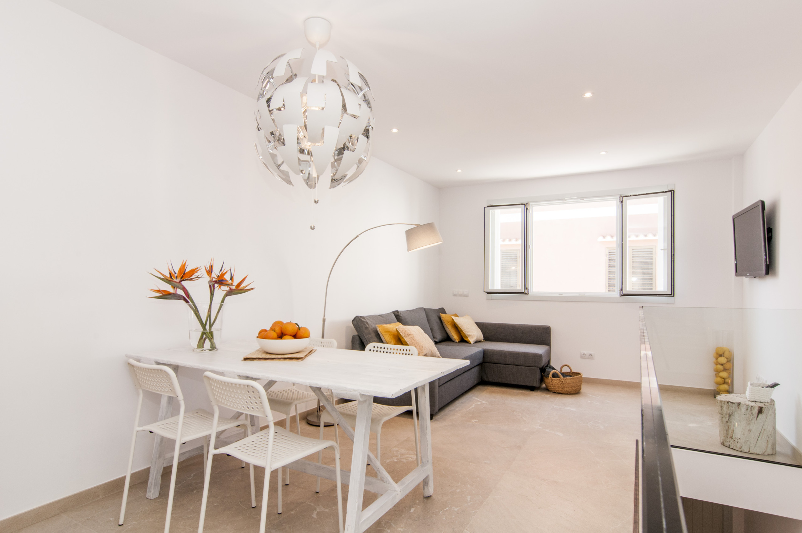 This apartment is located on the first floor of a block of 4 apartments near the Arenal beach in Portocolom. The apartment has a beautiful living room with white furniture in a modern Mediterranean style. The kitchen is American in blue-grey color, it is fully equipped, from the dining room we access the private terrace, where there is a dining table and access to the community pool.