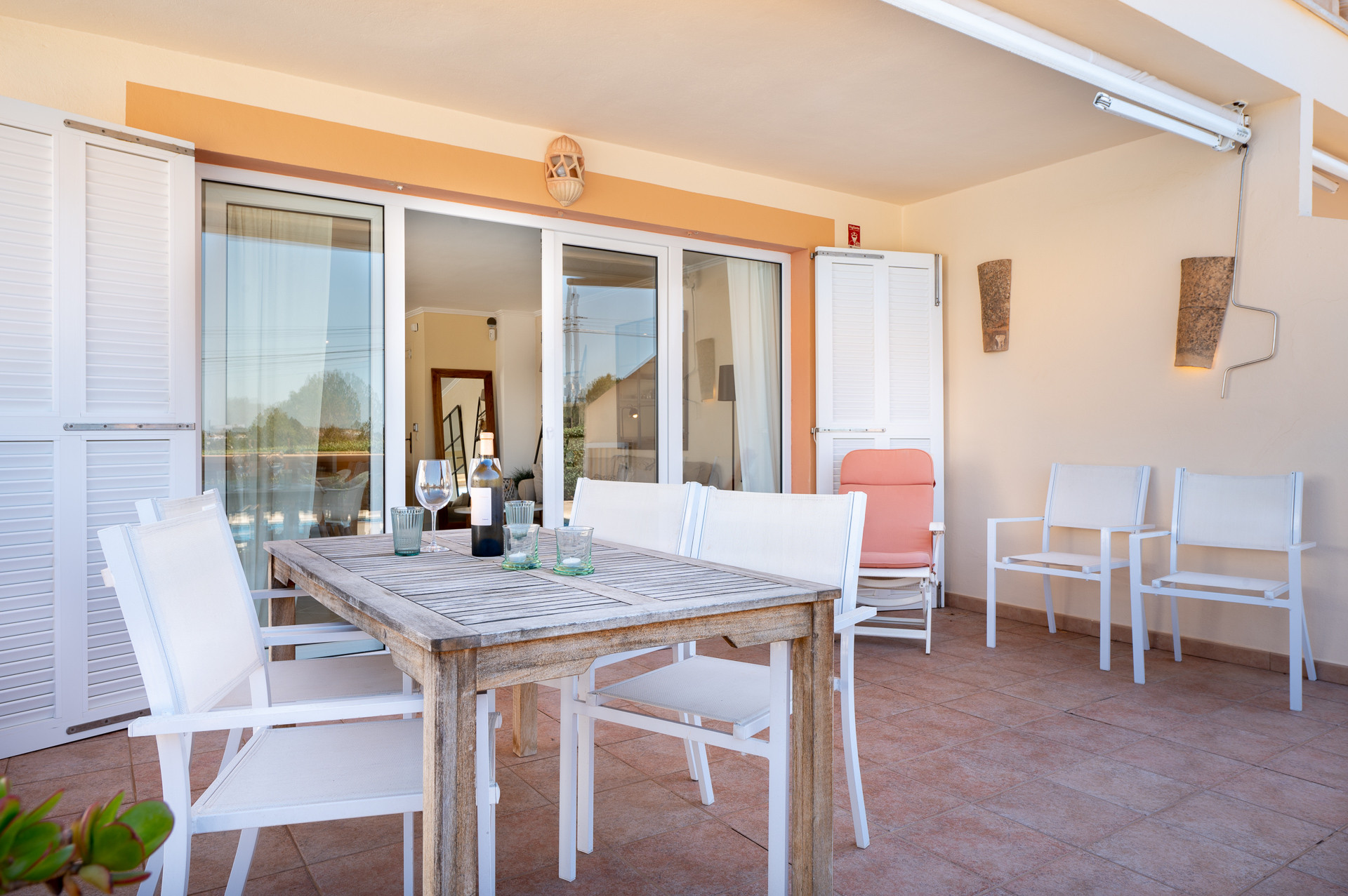 This apartment is located on the first floor of a block of 4 apartments near the Arenal beach in Portocolom. The apartment has a beautiful living room with white furniture in a modern Mediterranean style. The kitchen is American in blue-grey color, it is fully equipped, from the dining room we access the private terrace, where there is a dining table and access to the community pool.