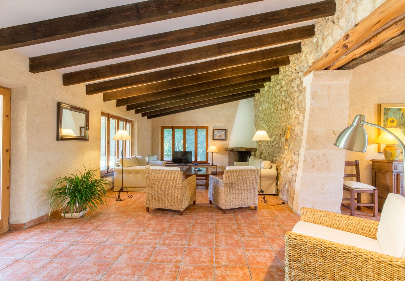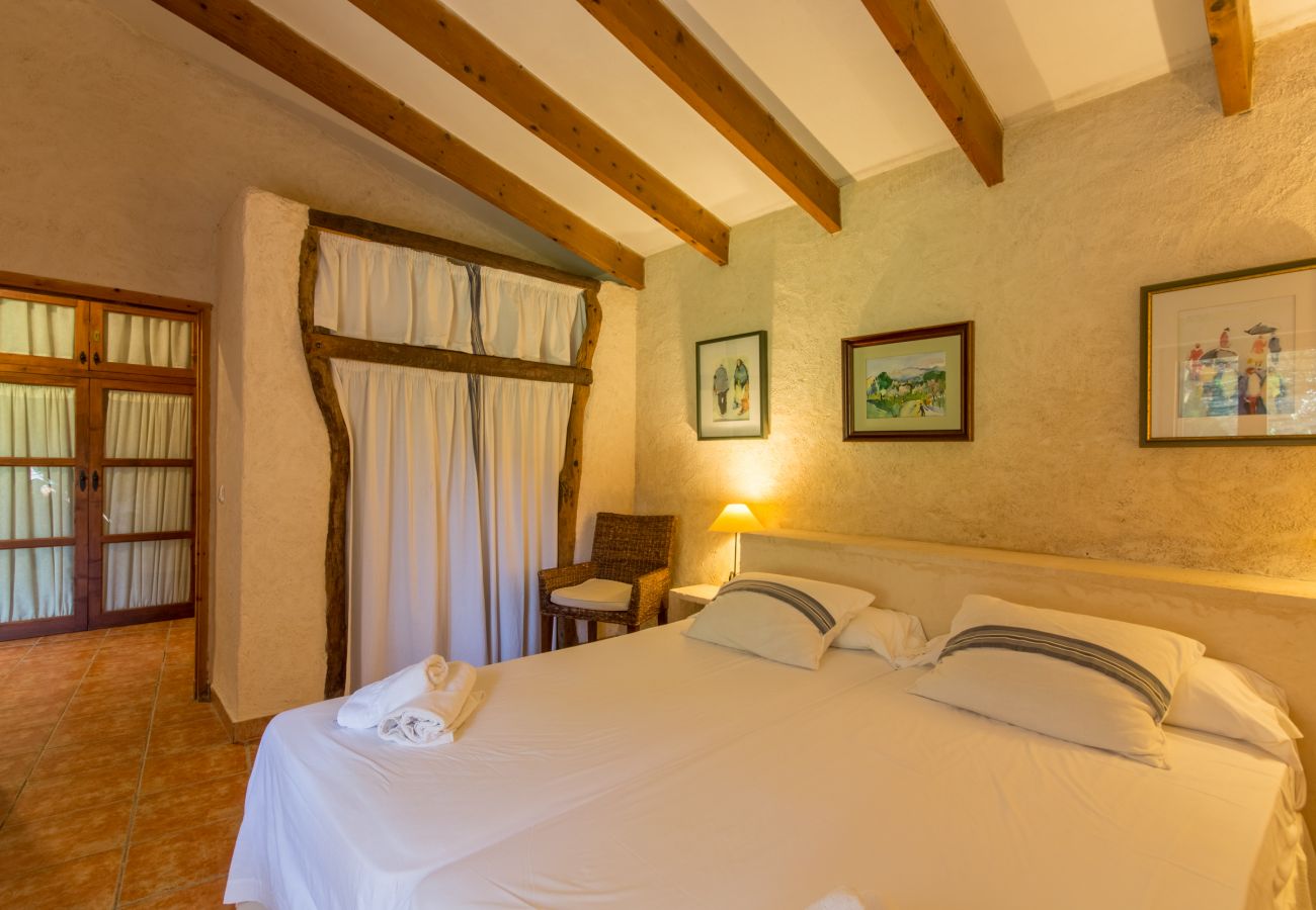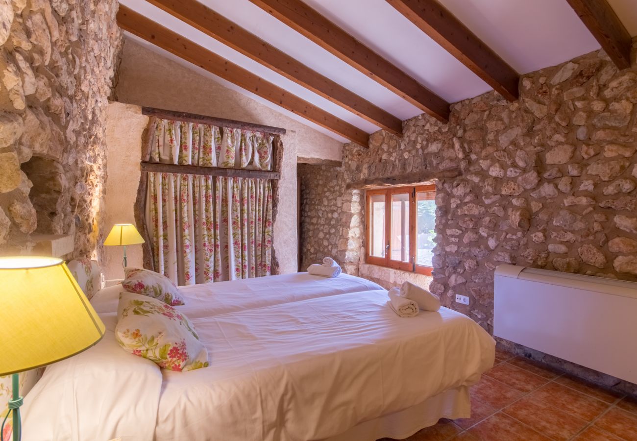 The country house "Sestadors de Búger", made of natural stone, stands out on this beautiful piece of land, between trees, bushes and a variety of plants. The typical Mediterranean "Buganvilia" runs along the house facade of the main building and gives the natural stone look a fancy fuchsia touch. The large main building consists of one floor where we have a rustic living room with open dining room, fully equipped kitchen and a sleeping area with 2 double bedrooms and 2 bathrooms en suite. The interior is spread over 230 m² of beautiful rustic living area, which with natural stone walls and rustic wooden beams gives the feeling to be in a cozy-modern cave. The furnishing and decoration of the house matched perfectly and promises besides quality and good taste a totally quaint living surface. Amenities include air conditioning, fireplace, free Wifi Internet, as well as cots and high chairs for our little guests.