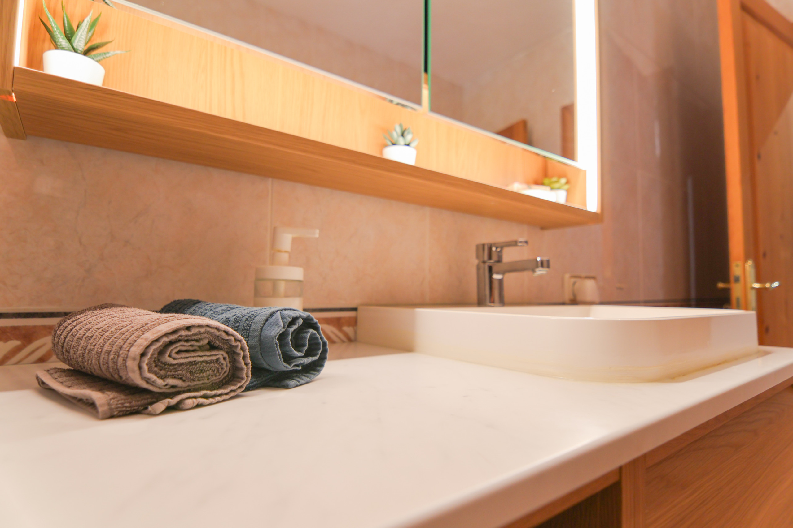 There are three bedrooms, one with a double bed and two with two single beds and two bathrooms, one with a bathtub and the other with a shower.
