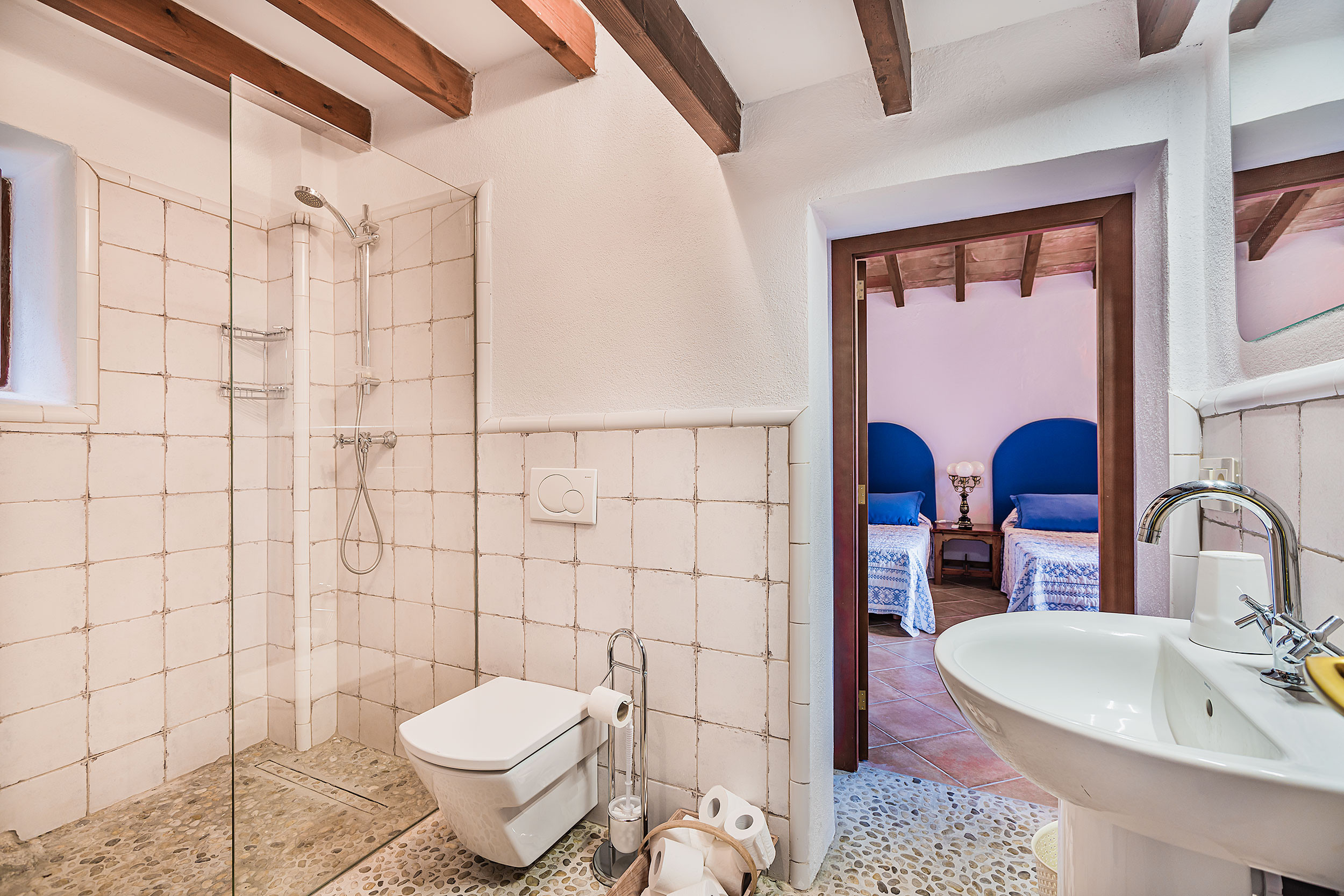 From the living room you have access to the two bedrooms. The first has a double bed and en-suite shower room. A (lockable) inter-connecting door leads into a twin bedroom with lounge area and en-suite shower room- it is possible to separate these rooms. The twin bedroom can also be accessed via its own entrance on the terrace.